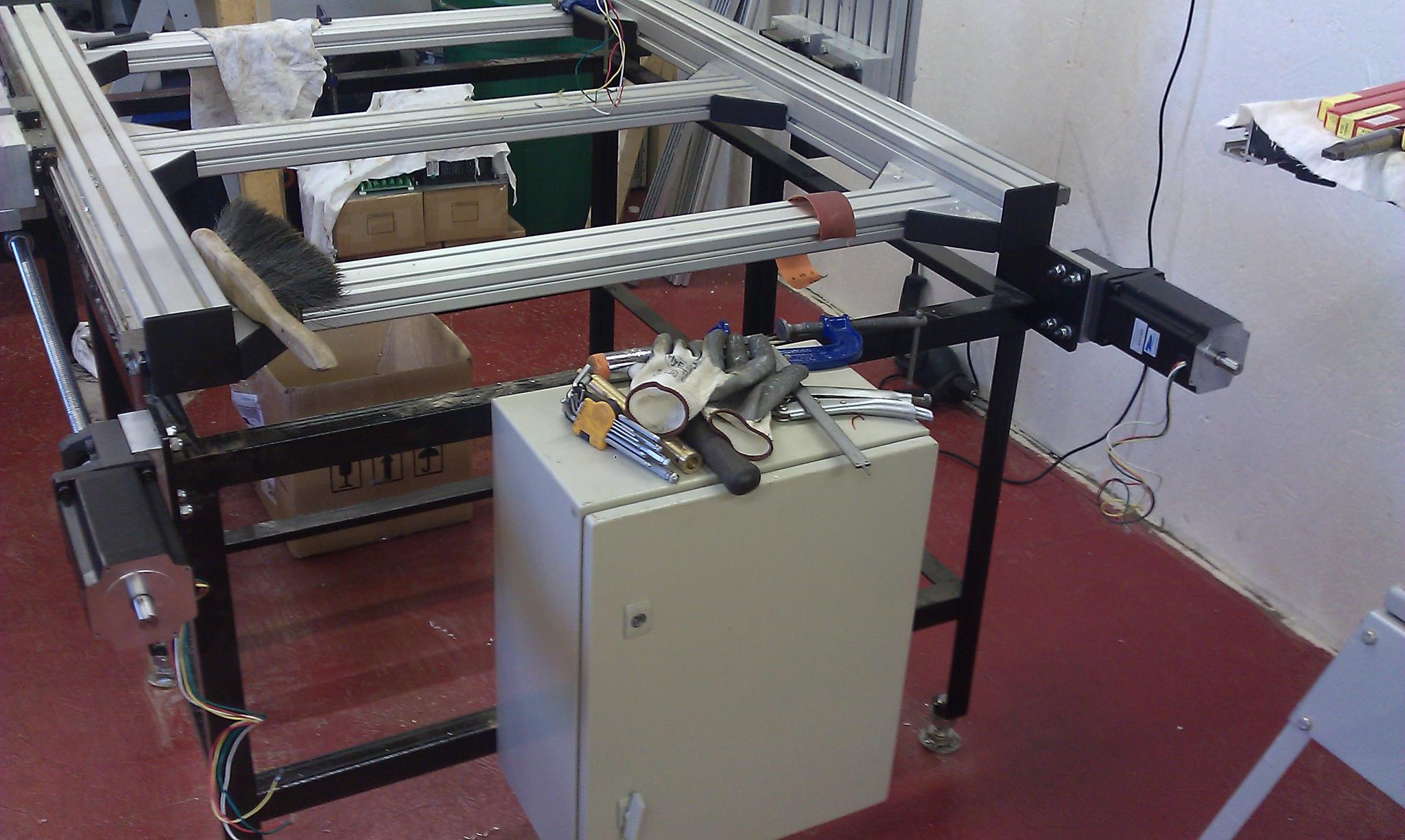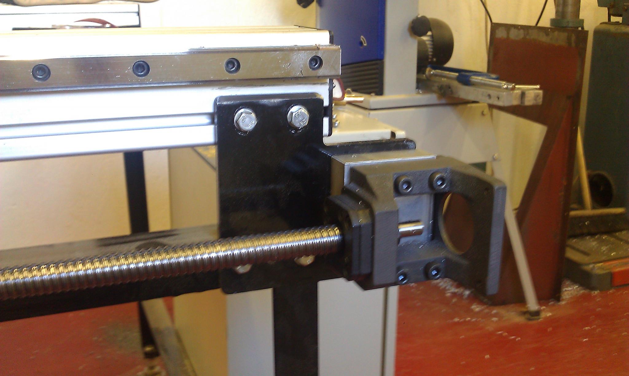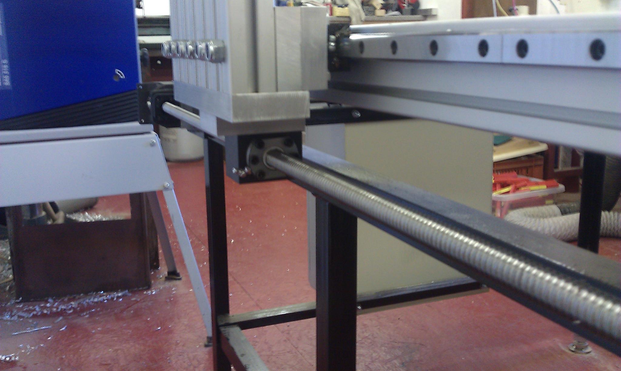 Which motors are those? I'll be interested to see what feedrate you can get on the X-axis, and whether it's limited by screw whip or motor torque. I'd have been inclined to get 10mm pitch screws. With 20x5mm over that length you're limited to roughly 5000mm/min in theory. Twice that feedrate but less resolution (depending on pulleys) with 10mm pitch screws. Bit late now I guess.