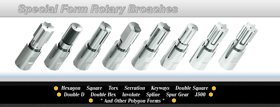 conventional broaching method. The conventional method has a sequence of polygon forms that increase in size and are pushed through a hole until the desired form size is achieved. Rotary Broaching can achieve this in one pass by cutting the full form, one corner at a time, without the need for a secondary operation. This works exceptionally well on Horizontal or Vertical Spindle Machines such as Lathes, Mills, etc.