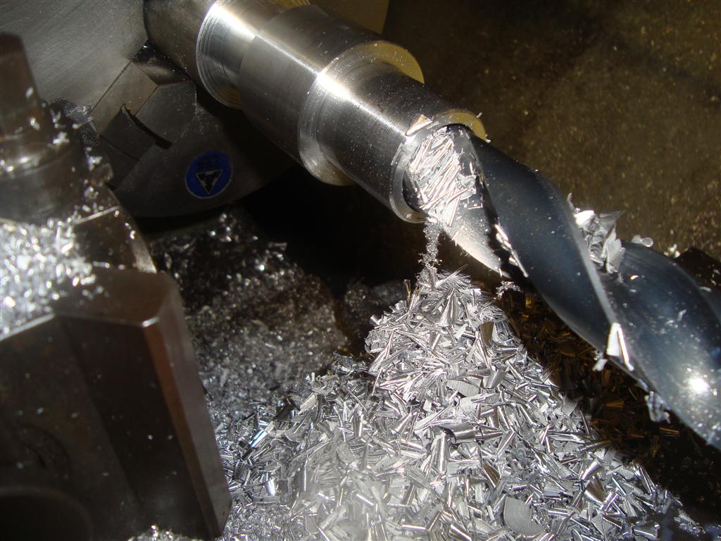 When I machined the shaft on the lathe I got only small pieces of swarf, not the long stringy stuff you normally get - see picture below of drilling it for what I mean. It was almost like cast aluminium...but it's not. Must be a strange grade?