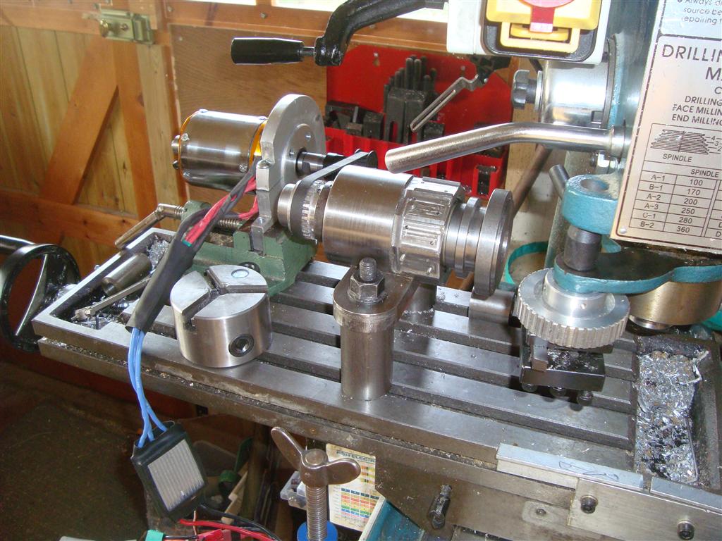 The motor, though only run on 24V from some big batteries - not the 48V that it is rated for, and geared for 2900rpm works well at the much lower rpm required to machine the face of the spindle which is 80mm diameter.