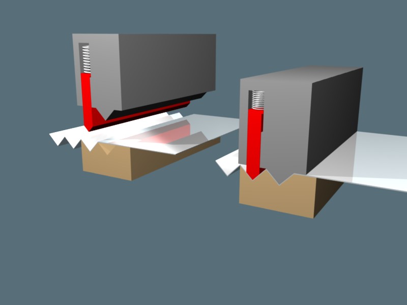 It might be worth to me perhaps up to £1000 if someone could make 2 metre long press brake corrugating double V-dies and top tools, with one of the top tools spring-loaded as shown here.