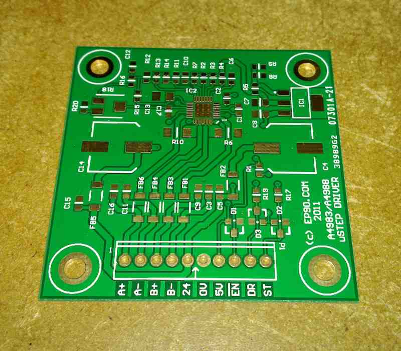 I only had 1.2A motors in the lab, but it's been running nicely all evening (from a pulse generator) set to 1.5A. It's a very basic design, made almost entirely from junkbox parts. There's no isolated inputs or protection circuitry, though there are emc filters on the outputs. This board has a A4983 device fitted, but the ones destined for the mill will use A4988, which run smoother at low speeds.