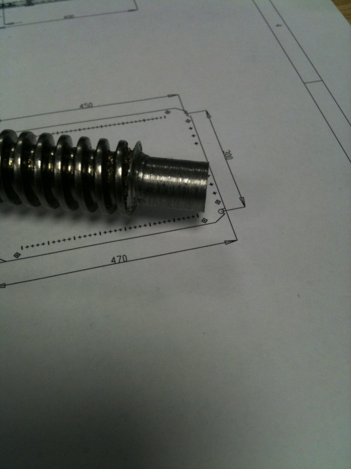 Just been trying (and I stress trying!!!) to do some machining of my lead screws in my lunch break...think I'll get someone else to do it! The jaws are worn and it takes ages to get them to clamp so it spins true and I had to shim the cutting tool so it was somewhere near the correct height...results of 3/4 hr below lol