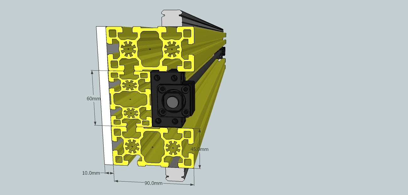 I added a 60x45mm extrusion in between the top and bottom extrusions. These can all be bolted through from the top and also screwed into the 10mm back plate. Now your worry about the weaker wider section is dealt with, plus that extra piece for 800mm length is only £12, sweet.