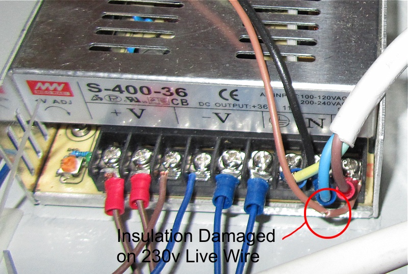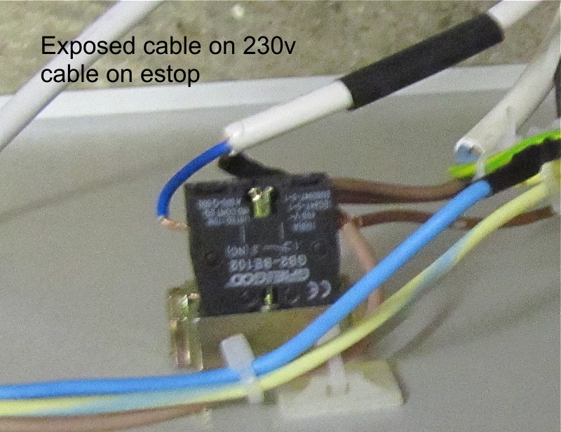 - 230v live wire sheathing damage potentially allowing for contact with the chassis