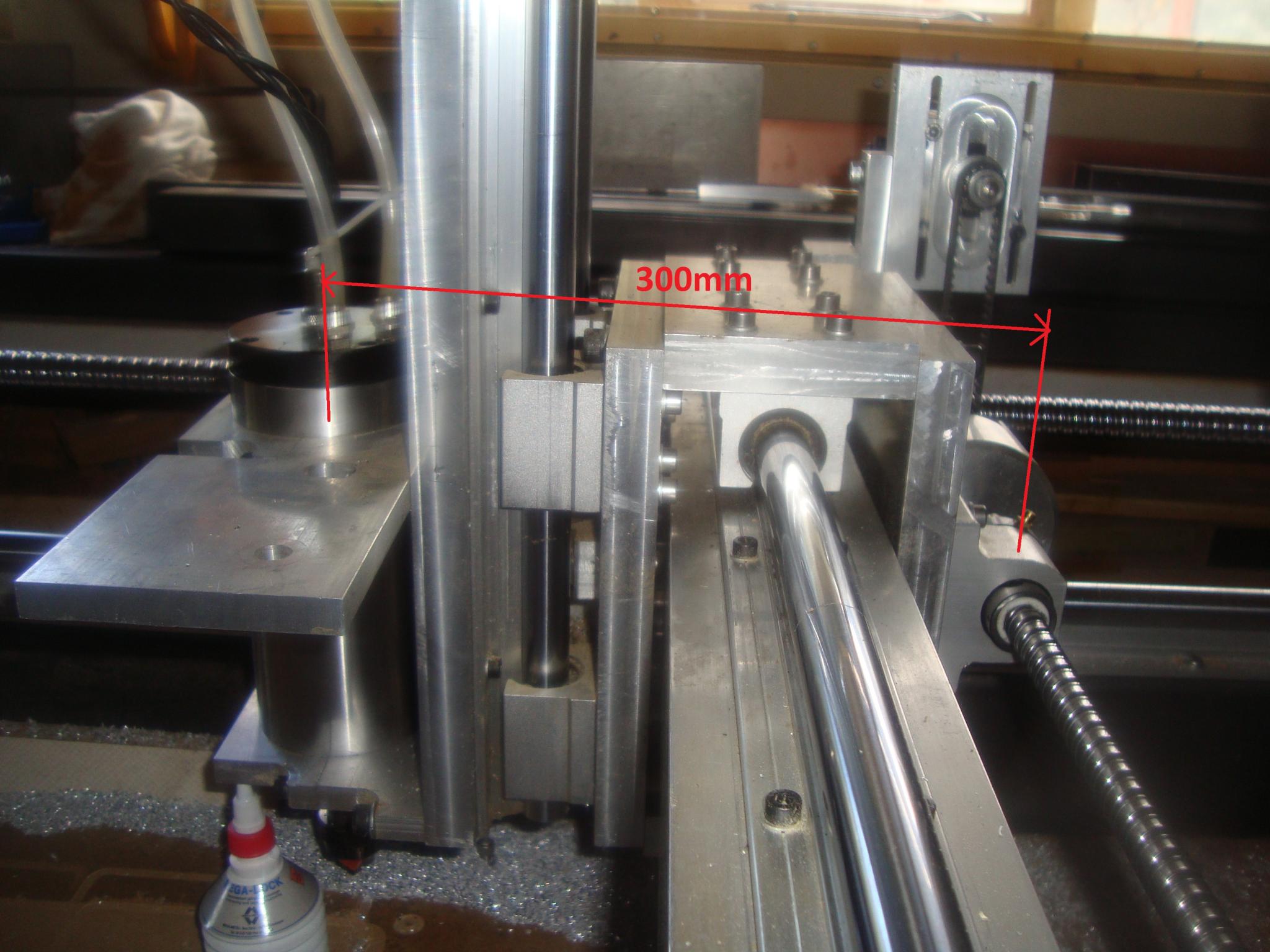 On my router the distance, measured parallel to the X-axis, from the Y-axis (across gantry) ballscrew and spindle centre line is about 300mm. This allows the tool to deflect in the Y direction since the support is effectively 300mm away and the aluminium in between and the screw will bend since the linear bearings offer little support...