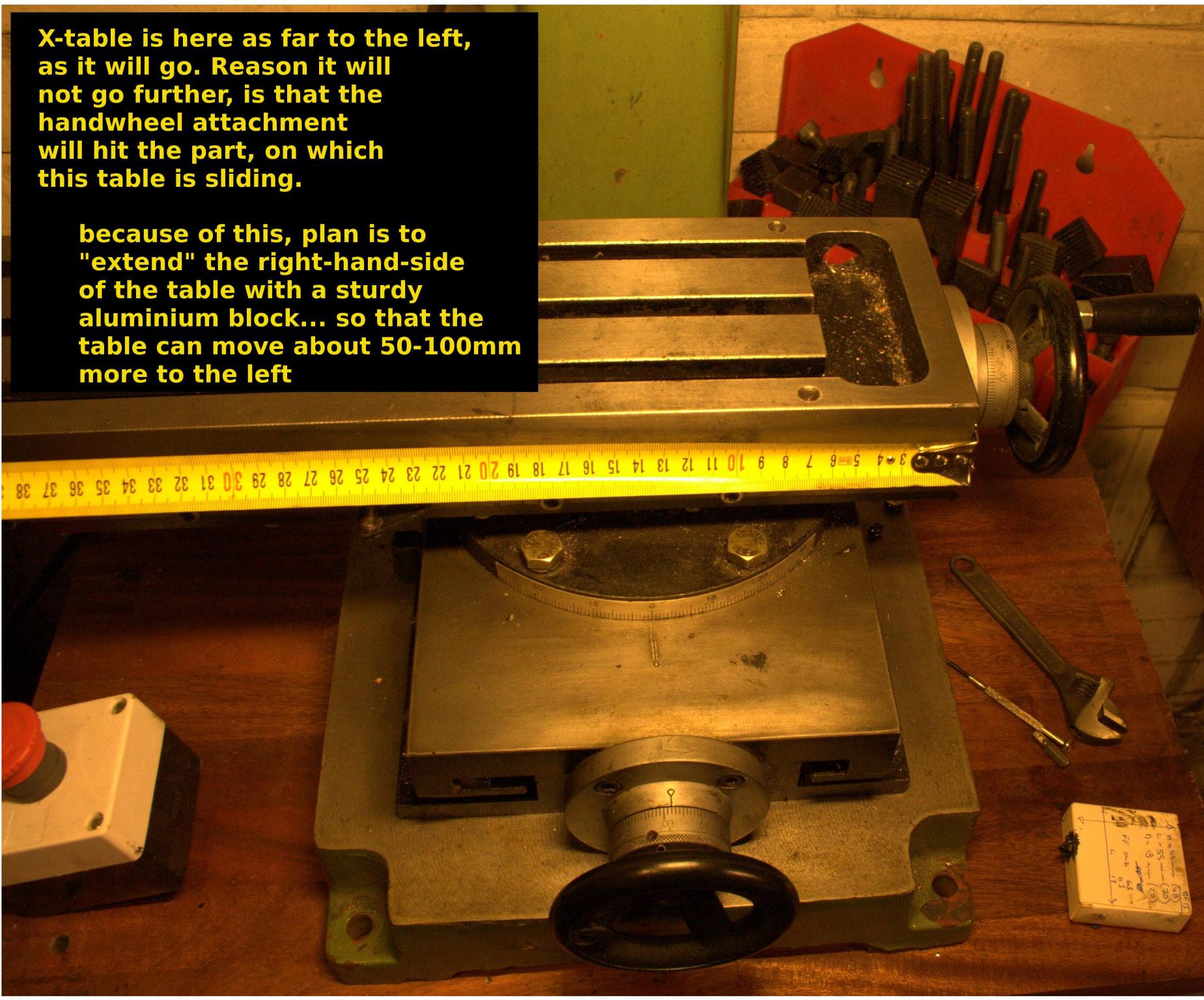 This "extension" would change X-axis movement from 220mm to around 400mm. Think there might be challenges ahead, with accuracy/slack, at the far end of the X-table movements. However, I have reasoned, that perhaps one could bring the slack down with careful adjustment. Just have been thinking, that there may be situations, I would rather live with a small slack at far end, than reposition the object on the table (because of lack of X-axis movement).