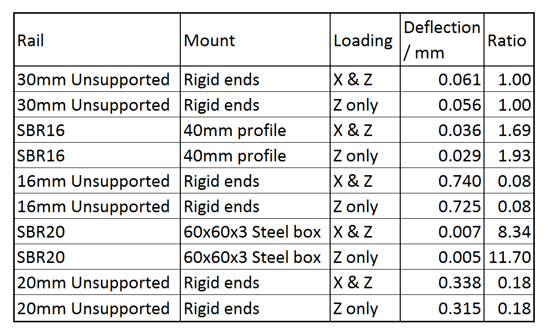 I would love to see a similar analysis of profile rail. Just how significant is the support structure? 20mm plate, 40mm and 90mm section, aluminium and steel. After all, £600 worth of rail is meaningless if the £100 worth of extrusion allows deflection on a par with round rail.Last edited by ecat; 01-04-2012 at 10:18 AM.