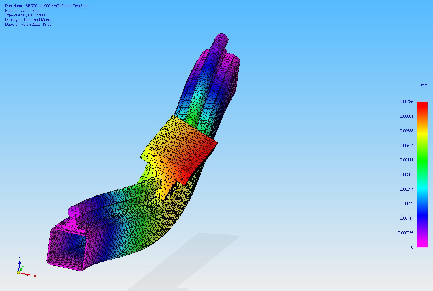 Unsupported rail 200N in Z direction to simulate weight of Z-axisand 50N in parallel to X for cutting force: