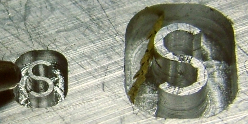 This pic shows a smallest possible letter 'S' I cut into aluminium using a desktop mill with a 5 micron step. This is extreme close up, spot the thread of tobacco and ballpoint pen tip. The cut on the right was a 1mm tool, the cut on the left was the 0.5mm tool (see pic 2). Tool turning at about 3000 rpm.