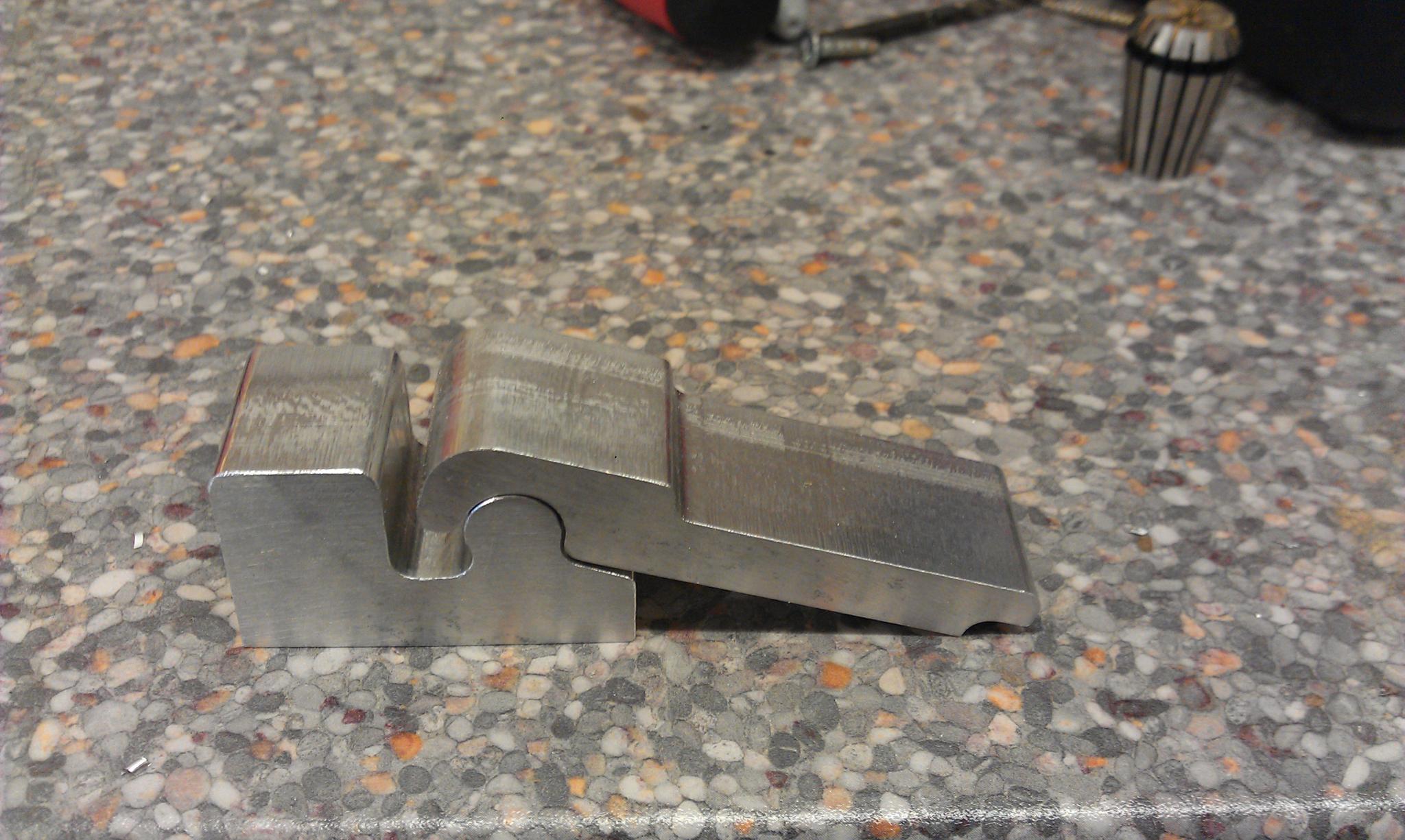 The top section in the first photo will have a slot milled in it to accept a screw which is used to clamp the section down on to the workpiece. If you imagine the right hand top surface of the right hand part in the second photo having the slot. The screw goes through here and clamps the "hinge" part down to the work table. The hinge part will allow the clamp to hold down different thicknesses of material.