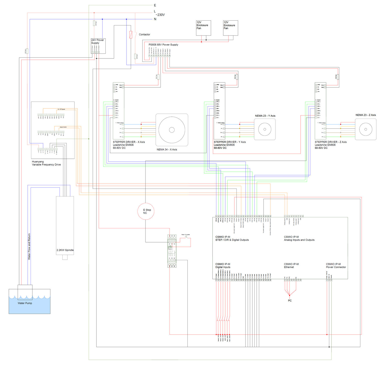 Attached is my first crack at a circuit diagram for the machine. I am not sure that I have got the pilz right and I think the estop circuit in general could do with some work as the spindle is not currently part of it. Do I connect to the same contractor I have for the stepper drive power supplies or another? I have a couple of relays left on the pilz X1 if I need them... Also, I'm sure I have read that you shouldn't just cut power to the VFD...?
