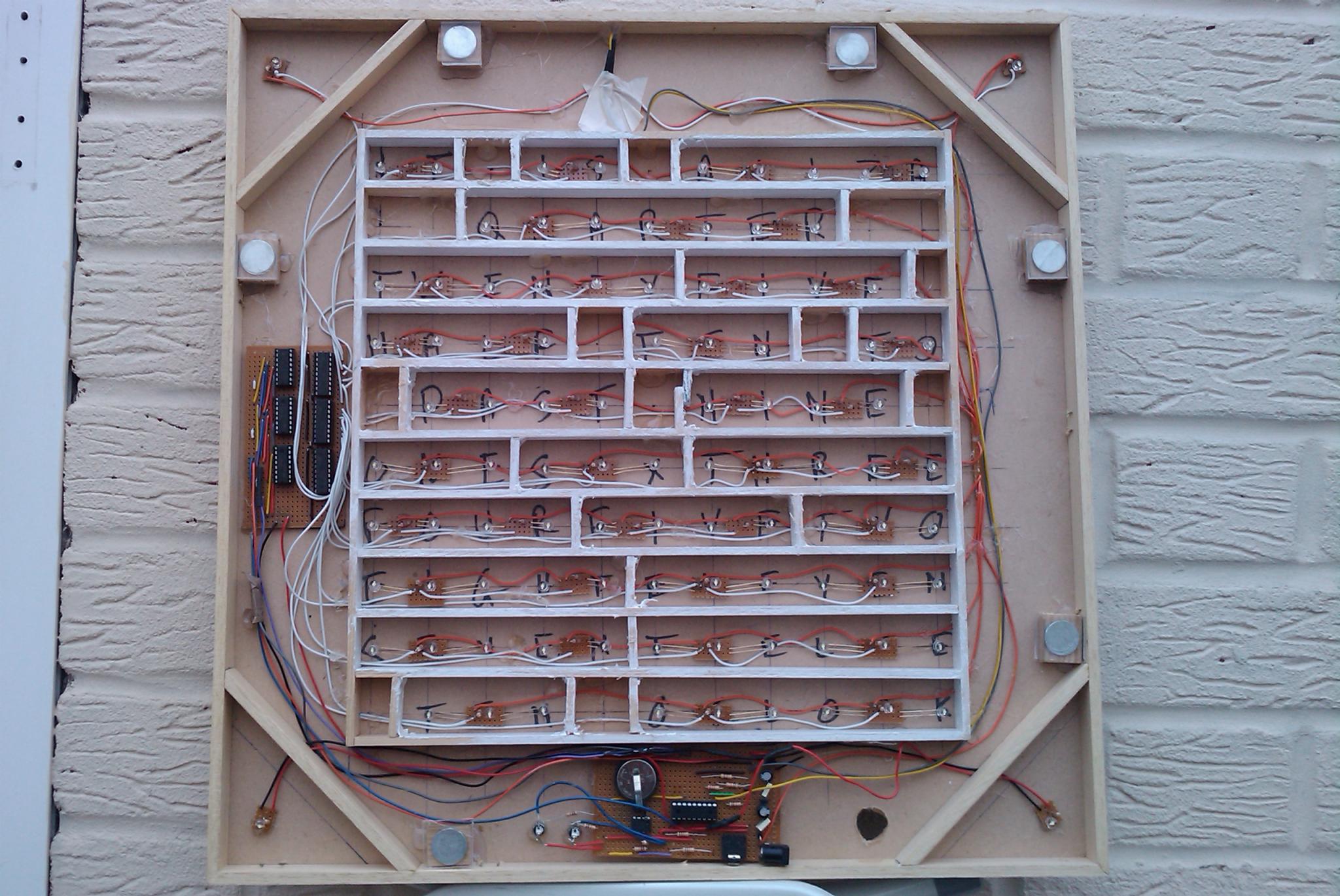 The clock is called a word clock. I saw it online somewhere for near a grand so I thought I'd build one. Cost me 50 quid. Electronics were designed and built using the diy Picaxe microchip system, a time crystal with backup battery and shift registers. Just downloaded all datasheets and followed instructions. Electronics isn't my day job, so I learnt from research just as I'm researching to build a cnc. Inside may not look professional but the exterior is bling bling. Basically clear perspex with vinyl sticker stuck on the inside for a supper glossy effect.