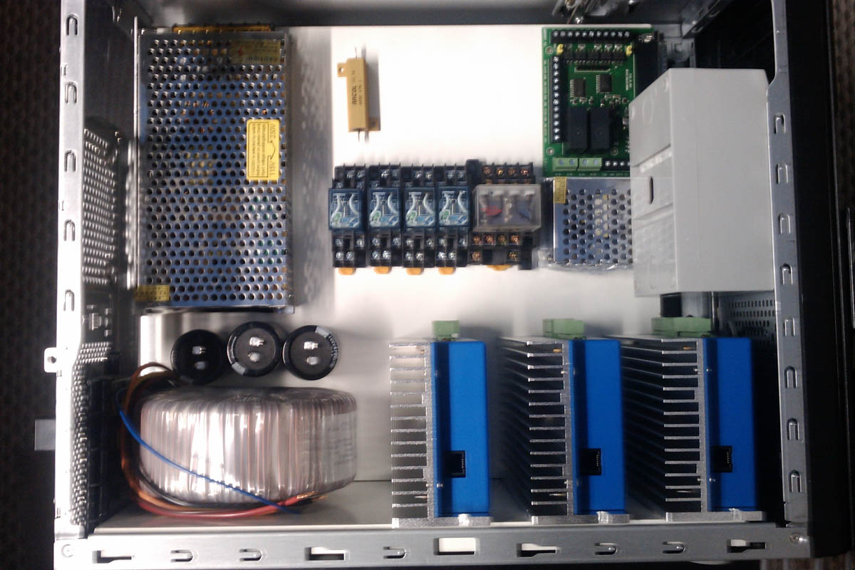 The first picture is my control box layout inside of an old pc case. 12v, 24v and 70v psu are here along with drives, safety relays, discharge resister, BOB and fuse box.