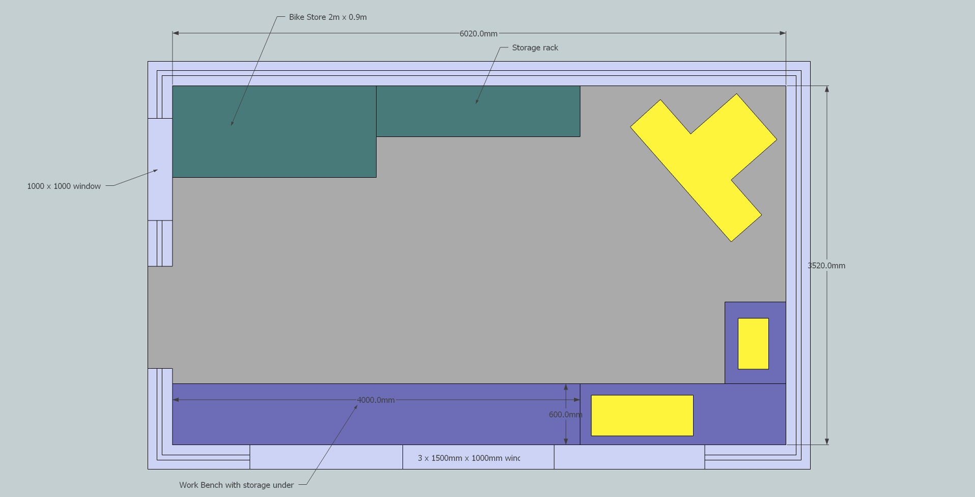 Give me a continuous run of 6m of workbench with the lathe and grinder at the end, lots more windows and therefore light and room to put the bike trainer up when I can't get out and ride... and i could make it 0.5m narrower if need be (but I dont want to). Will make it a single pitch, 2.5m at the front sloping to 2.25m at the back (top of pic)