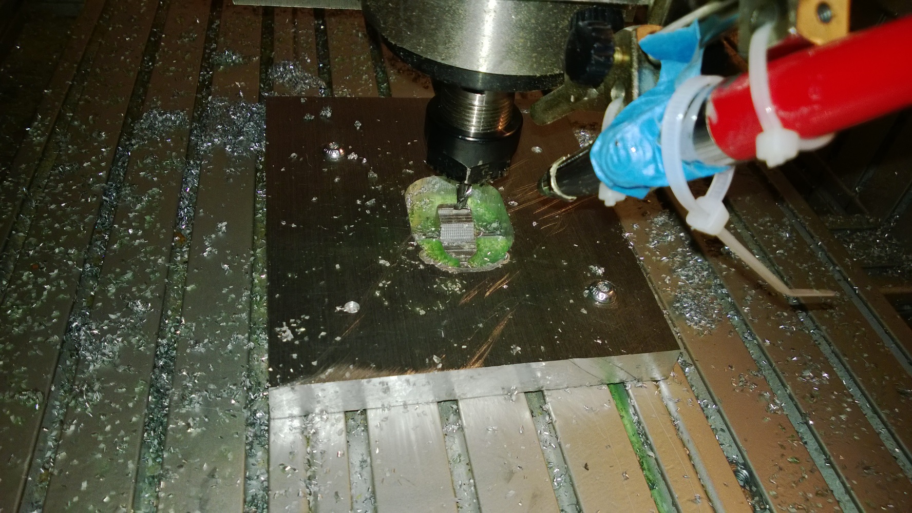 Whilst there was no mishap like last time, the difference between a conventional path compared to a climb was night and day i.e. the climb milling threw the chips out (and this time the chips looked like nice shiny chips rather than welds :) ). The conventional paths didn't throw the chips as well but the machine grumbled through the material, in fact the "grumbling" was vibrating the whole workbench