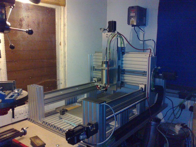 For the sharper eyed amongst you I didn't have my new gantry mounting brackets on when I took this pic, but they are ready. Also for some reason the flash on my crappy camera phone has made the ali extrusion look like I have pimped it with blue LEDs, but the coolant is indeed green. I've been using PC watercooling pump and fluid, as I have been water-cooling my PC's for years without any gunk forming and using a spare radiator/fan unit means I don't need much of a resevoir for water. So far I've yet to feel my spindle get warm after a continuous 54min session.