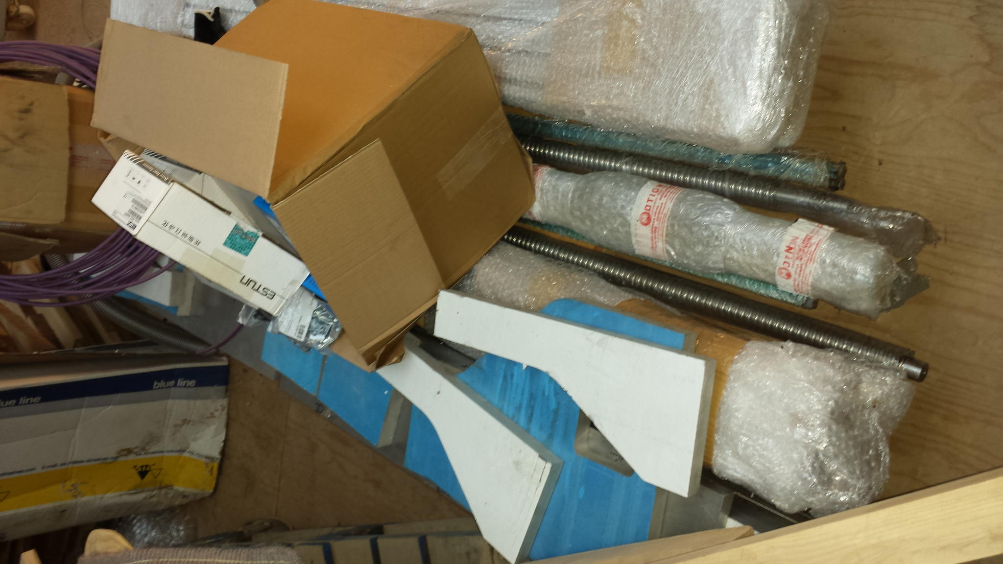 A pallet full of parts, some machined, some partially machined and some waterjetted.... the visible ballscrews are x axis and 32mm!!!