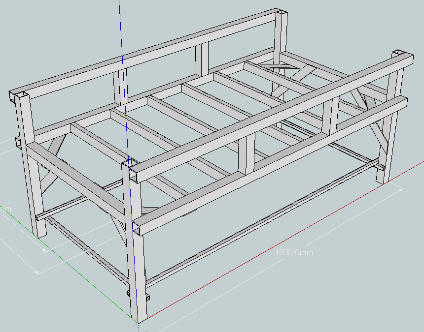 I've extended the X-axis rails to 1800mm which will mean a serious re-arrangement in the workshop, an extra support has also been included to up the stiffness. Bracing, in the form of 50x5mm plate, has been added to help prevent the frame from distorting. I think the bracing could be better but it should help once it's bolted down tight. The only other change is to move the long stretcher (at least that's what it would be called in woodwork) to the inside of the leg as I think it looks better that way. The weight comes in a at around 100kg which I can live with - I just won't invite anyone into the workshop :-)
