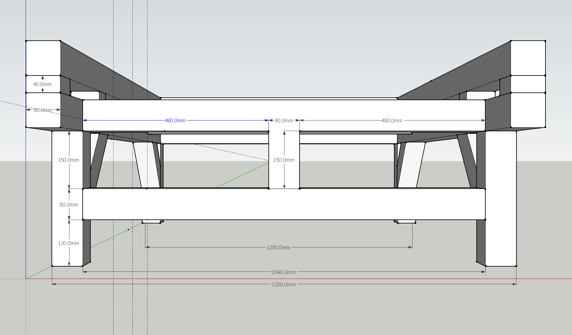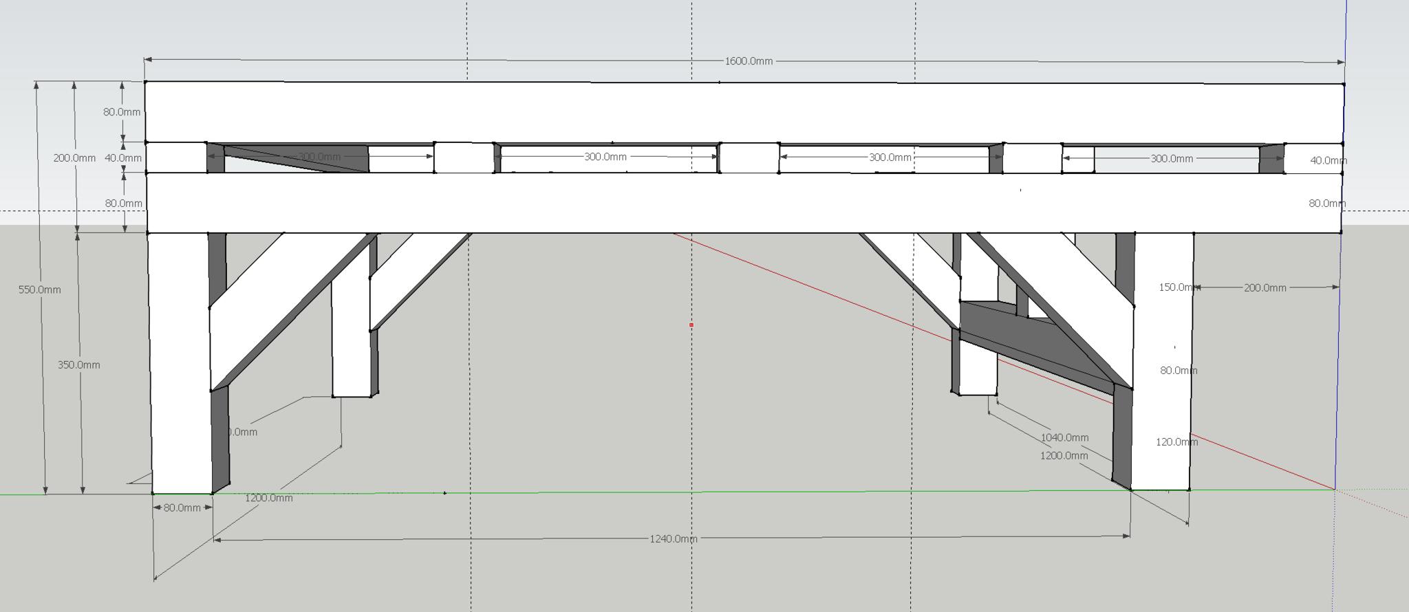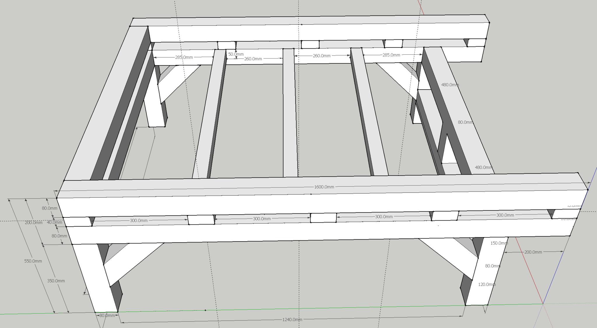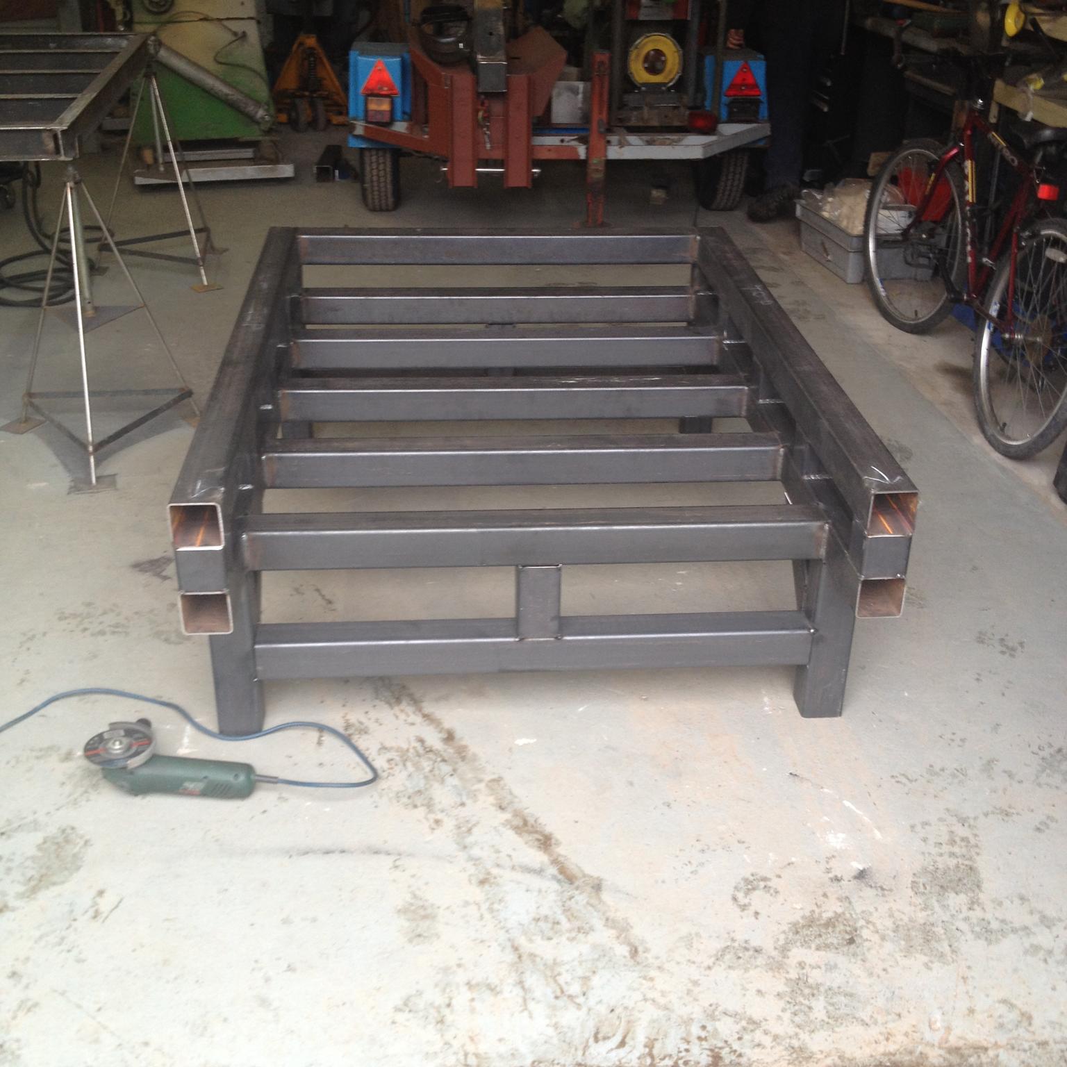 Thanks Jazz. I skimped on the extra rail in the design to keep the Steel costs down to two lengths. What I'll do is find some smaller sized box section for the central bed support, put two or three support rails in there (depending on size) and use the existing single span of 80x80x3 to create the support triangles at one end. I guess at this point I could go for triangles on the 'fixed' end or just move the central bed support rail to the same height as the top rails to create a U shape. I'll draw them up shortly and ask for comments.