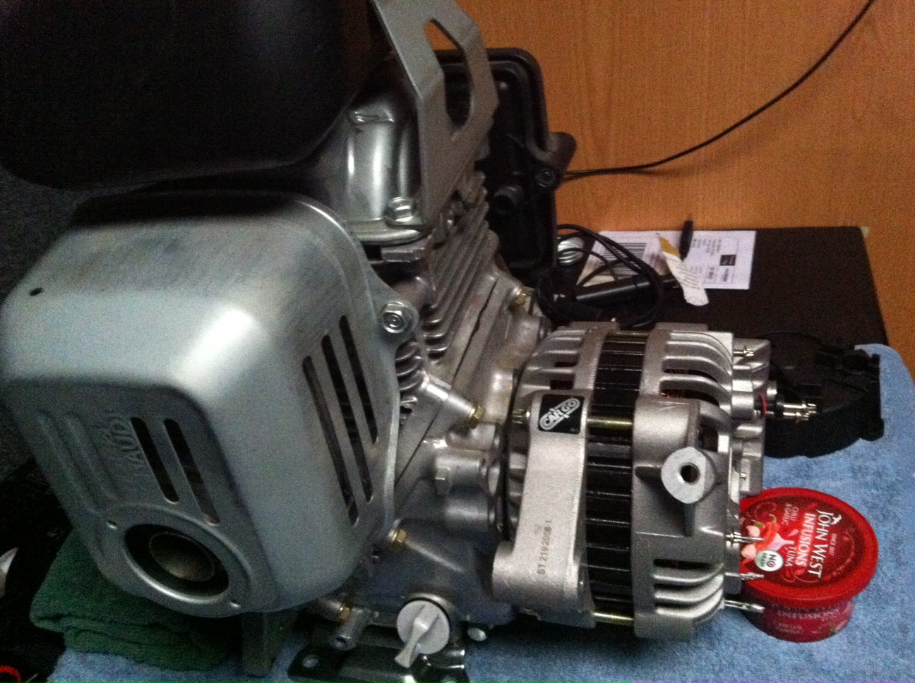 In summer I can pretty much run my cnc as often as I like (lots of solar power), for winter I built a 12v generator out of a Honda GX100 by boring out a 100A alternator and fitting it directly to the Honda output shaft: