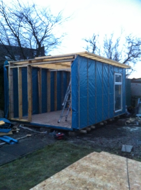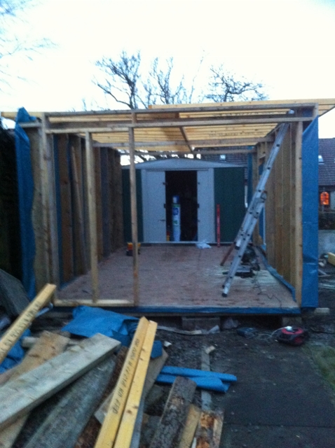 I'm leaving the metal shed intact and lockable where my tool boxes ect will be housed. There will be a a wooden frame attached to the shed which makes it easier to join the two. Just woke up to find the weather forecast to be correct, feckin snow again. Supposed to rain later, and I'll get back to it tomoro. I'm looking to have a log burner in it so heating the 2 won't be an issue. I'll be removing the metal roof and replacing with wood as the condensation is bad.