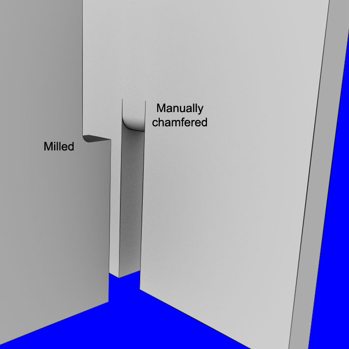 Obviously there won't be any internal right-angles because the end mill will have a radius. Where there's a square edge that fouls a radius, I'll manually chamfer off the corner to make it fit (see pic below).