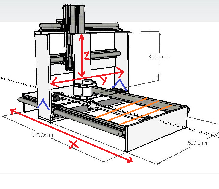 next thing id look at is that gantry... the runners on the x rails look far far to close together? Ive marked in blue.. look at pretty much any of the other legged lifted gantry designs on here or on youtube... all of them have the gantry 'legs' triangulated to spread those bearings apart a bit... otherwise imagine you are milling a straight line right the way through a work peace... the miller will go in the workpeace and you will then attempt to drag that entire gantry forward.. with the present design you will see flex in those gantry legs... in actual fact what you will see is judder.. it will move forward a bit.. the gantry will flex back. the gantry will spring forward and then move forward a bit again... unless you widen the part I have marked in blue (do you agree?)