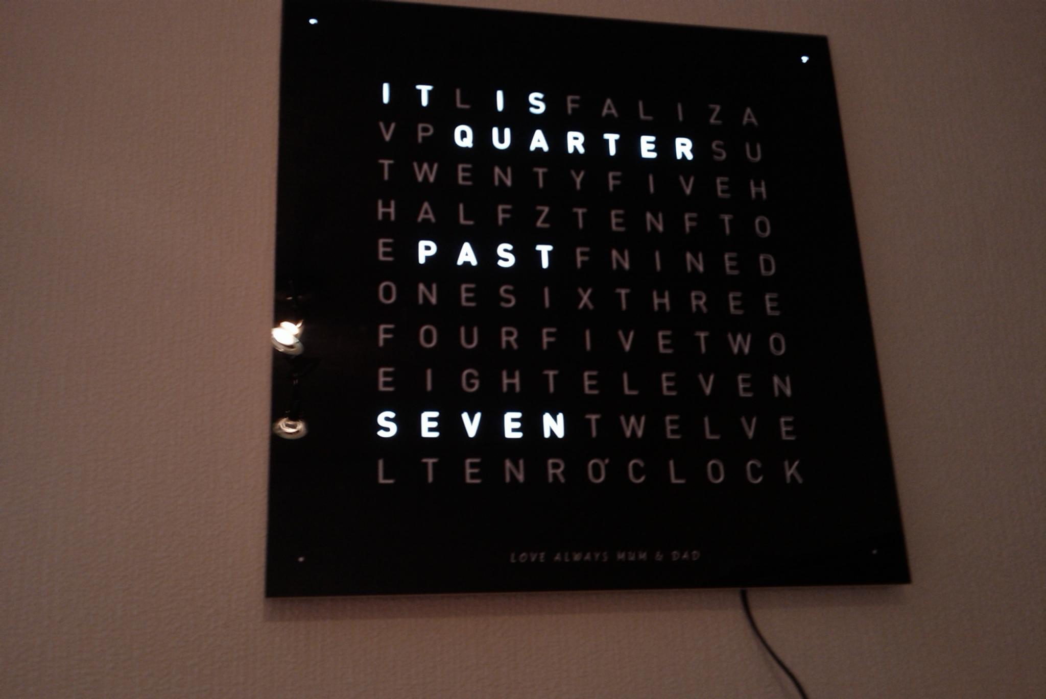 The clock is called a word clock. I saw it online somewhere for near a grand so I thought I'd build one. Cost me 50 quid. Electronics were designed and built using the diy Picaxe microchip system, a time crystal with backup battery and shift registers. Just downloaded all datasheets and followed instructions. Electronics isn't my day job, so I learnt from research just as I'm researching to build a cnc. Inside may not look professional but the exterior is bling bling. Basically clear perspex with vinyl sticker stuck on the inside for a supper glossy effect.