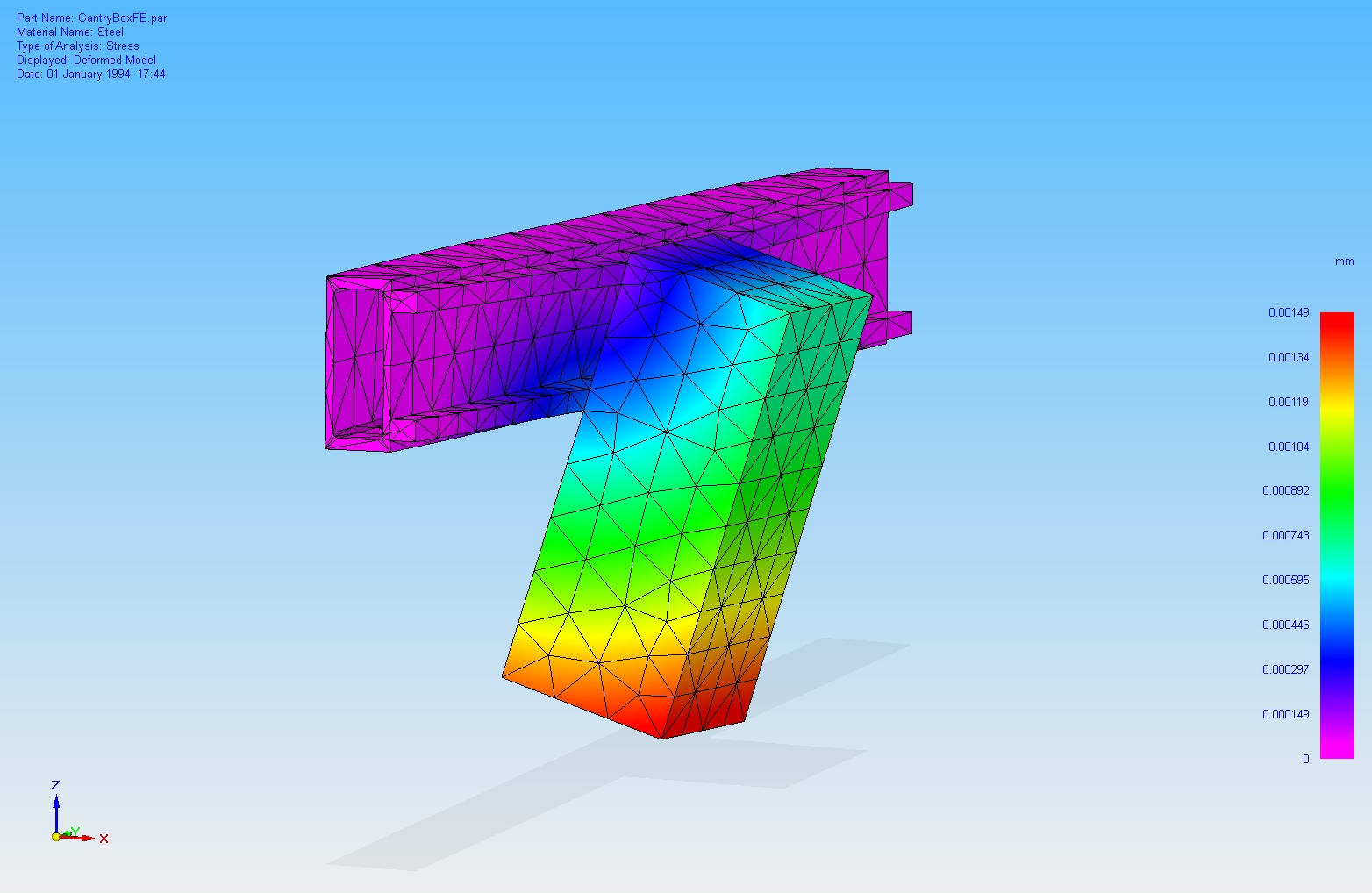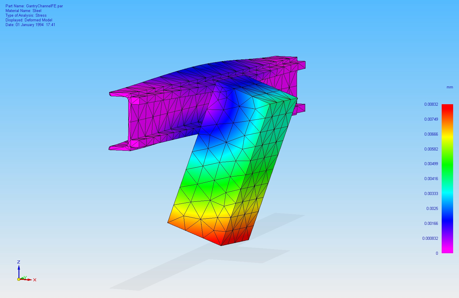 That's run with a 20N force, so nothing serious, at 200mm from the bottom of the gantry. Deflection at this distance (i.e. the tool) is 8.3um for channel and 1.5um for box section.