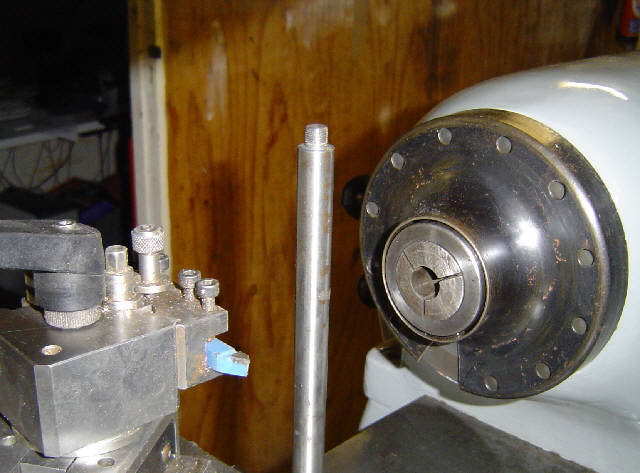 Turned it down to 3/8" - BTW if you haven't got a DRO on your lathe, get one. It makes turning things to size a doddle (it doesn't need to read down to 0.00005" :p). - got the threading stop almost in the right place... and Wow! now I see why HLV's have a reputation for easy threading.