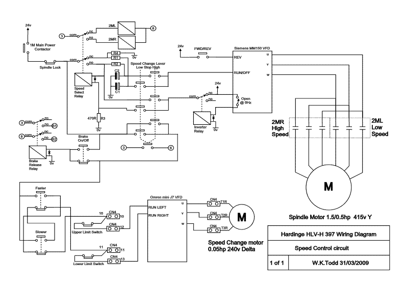 Looks good, My HLV is # 461 and thought it would be while before I saw an older one. I was too looking at swapping out to an Inverter, at the minute, I have it rigged so that the ctrl is supplied direct of 240 mains, (bypassing the transformer) and I engage the slow or high run relay’s before I tell the inverter to ramp up. (Not ideal – but ok temporary) I might inquire as to how Cyclematic lathes do their speed control. Do we know how the new Hardinges work ? – be good to see a new Schematic and even more interesting would be the New HLV that has just come out, with the servo leadscrew. In my case I have only just ripped out and restored the wiring to original and everything works fine so I may try to keep it original. Quick question,, with regards to the brake, you are still retaining the mechanical brake solenoid. This is the way I would be doing it, but thinking about it there may be some merit in using the inverter to do the braking, what are your thoughts on that? The auto transformer you are using is single phase, are you doing the same as me and feeding the inverter with 400V single phase ? and not running it at full capacity ? I should really get some pictures of mine on this forum.... I have just got to the primer & paint stage, (lotts of dammage to my carrige gears + rebuilding the carrige feed motor + revising its electronics have taken a lot of time) Best Jon P