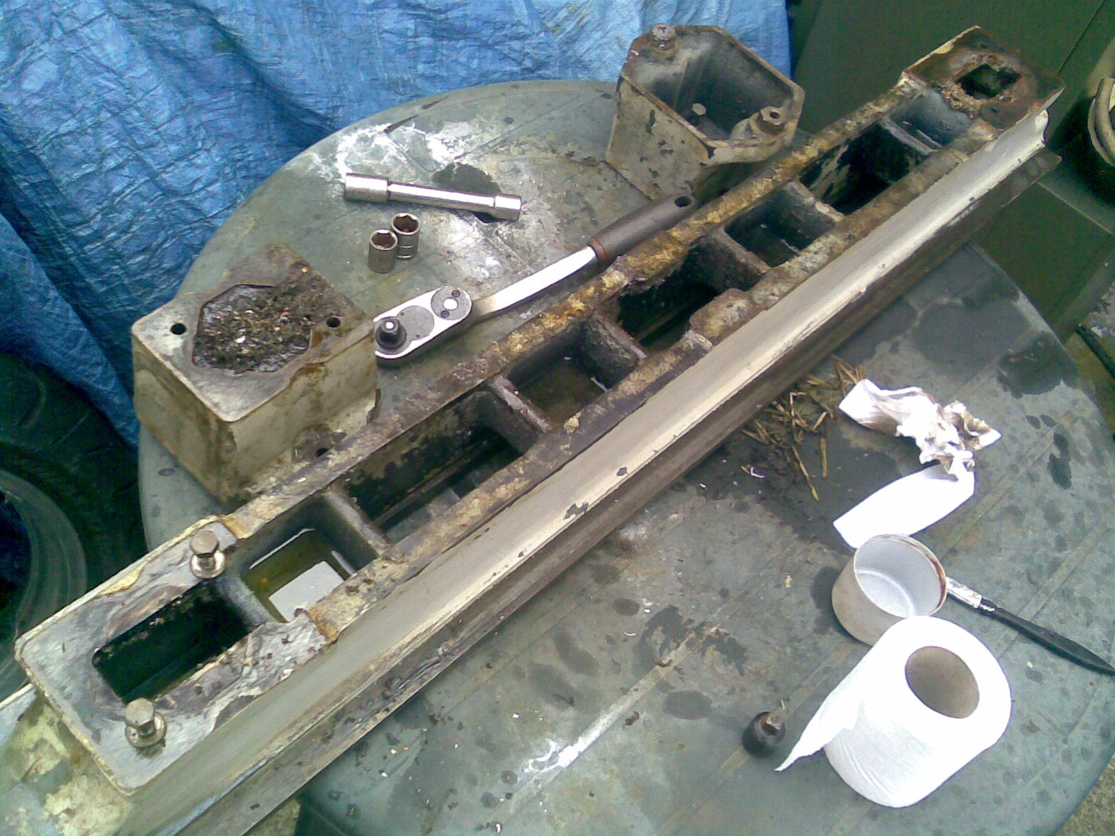 the lathe bed sitting upside down on the table, notice the solid lump of swarf reinforced grease ontop of the foot on the left