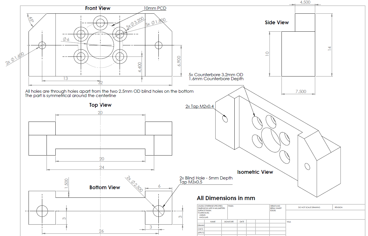 I am looking for the following part to be machined out of aluminium (Qty 2, T6 or similar). The counterbores may cause an issue (thin wall between counterbore and 6mm diameter hole next to it) but I can afford not to have them if they are not machinable. See image below.