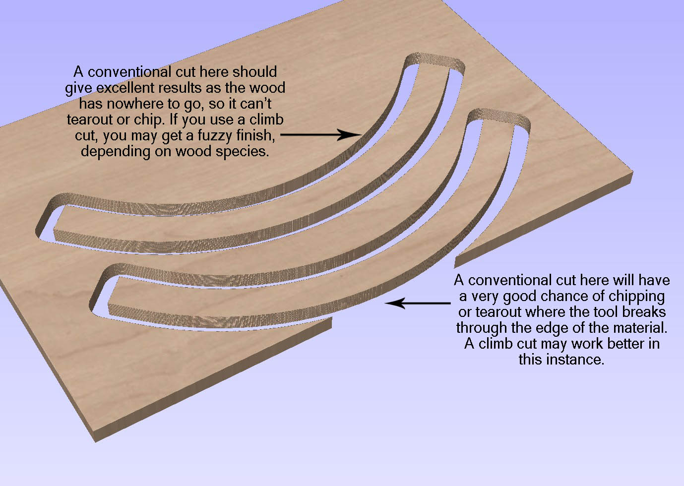 I nearly always 99% conventional cut in soft woods and man made boards MDF etc. Hard woods then I rough with Climb and then do a finish pass conventional, this cleans up nice any fuzzy bits.