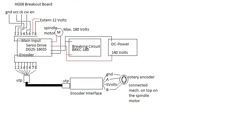 my problem is a mystery to me, I have, to my knowledge, tried everything to get my running spindle motor. The spindle motor is a DC motor max. 180 volts, placed on the spindle motor is a Rotery encoder with the outputs A and B and Z (Z but I do not use). The breakout board (5-axes) is a Mach3 HG08, ordered (CNC4YOU) Axes X, Y, Z, A, work perfectly. The B input is used for the spindle motor. Inputs are: GND, Vcc, CK, CW, EN (EN not connected). The first 5 are connected to a DG2S-16035 Servo drive (with 8 inputs total) via a UTP cable. Input 1 (CK) 2 (CW) 3 (GND) 4 (NOT USED) 5/6 (VCC) 7 (external DC power) 8 (External DC gnd). Encoder input of the DG2S-16 035 is connected via a UTP cable to an encoder interface, and the encoder interface is reconnected to the Rotery Encoder on the spindle motor. summarized: I have all the wires, cables, checked for fractures, but all cables are good. The settings in Mach3 (see photos). I have to be sure all components exchanged with new components, ie, the DG2S-16 035, the External Braking Circult Connector, Encoder Interface, and even the Breakout board (HG08), the Rotery Encoder, on The spindle motor, the result was the same, no rotating spindle.