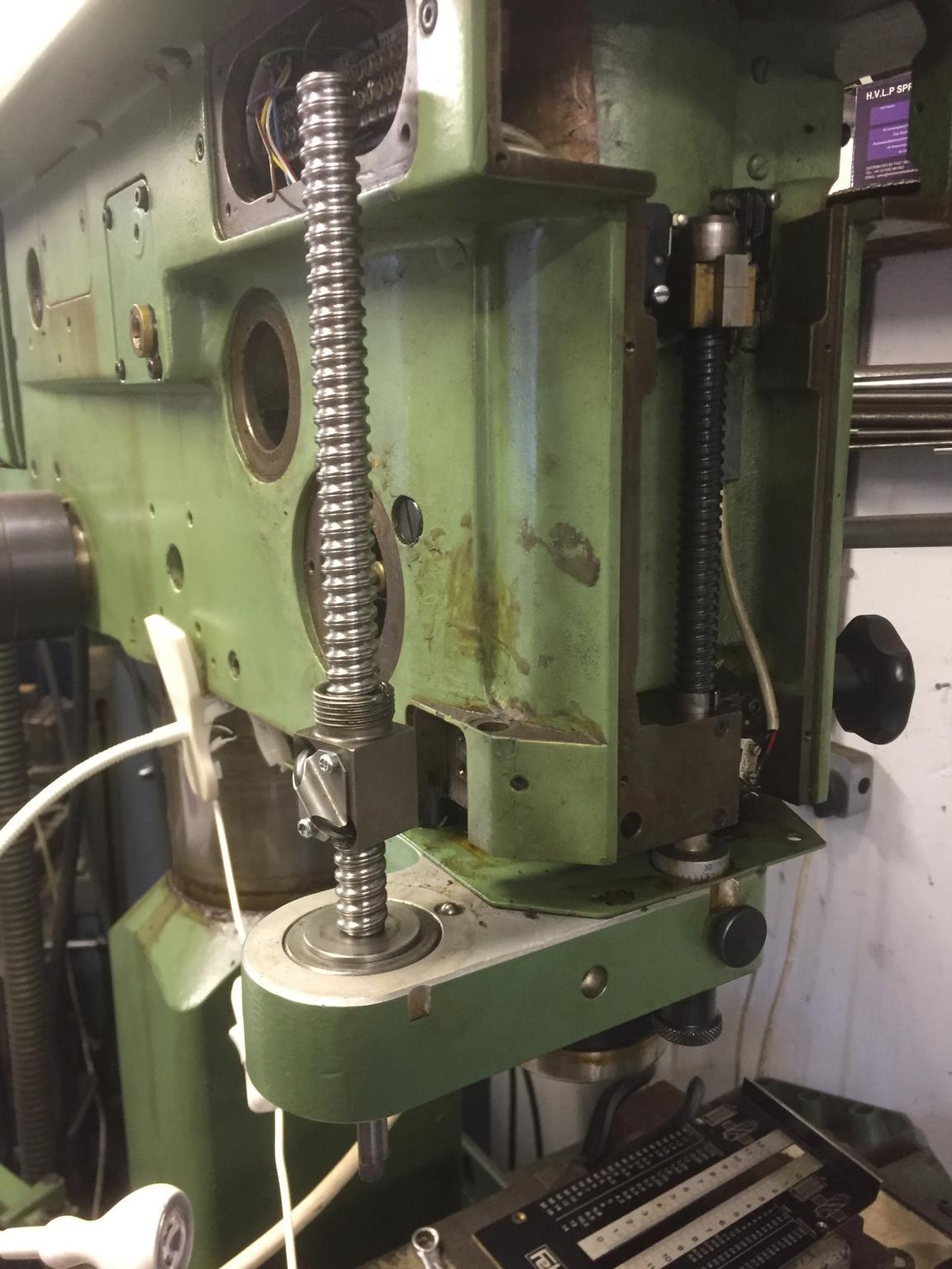The machine was previously set up with a very nicely constructed worm and wheel drive to the quill rack and pinion, but backlash in the worm and wheel (not the rack and pinion) has led me to consider using a ball screw instead. The photo shows an old actuator ball screw that I've set up to prove the principle.