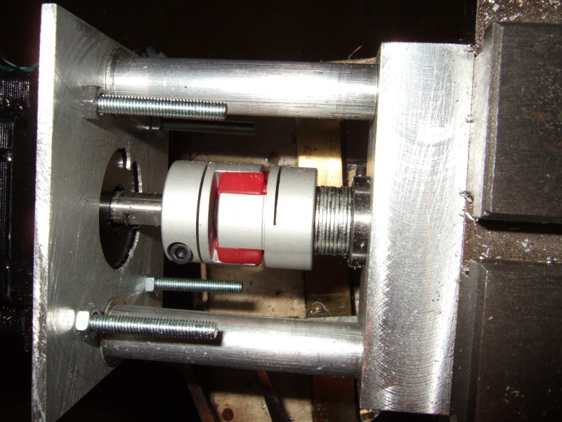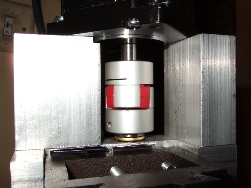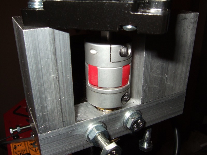 Preloading: With the axis, bearings and block in place, wipe the machined part of the screw clean of oil and fit the axis part of the 3 piece coupling, setting it just a little snug. Wind a M6 nut on to the existing thread that's poking through the centre of the coupling piece. Tighten the nut until it feels just right, ie not too tight. Tighten down the coupling screw and remove the nut. Test for any play. Job done.