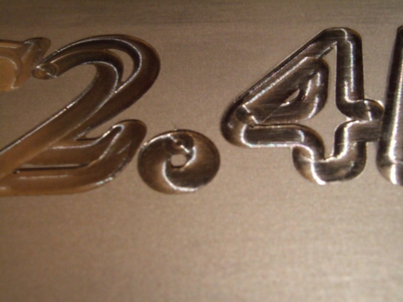 Part of the EMC2 - not designed for actual cutting - test logo, cut in 1 pass 0.25mm with a 3mm bit.