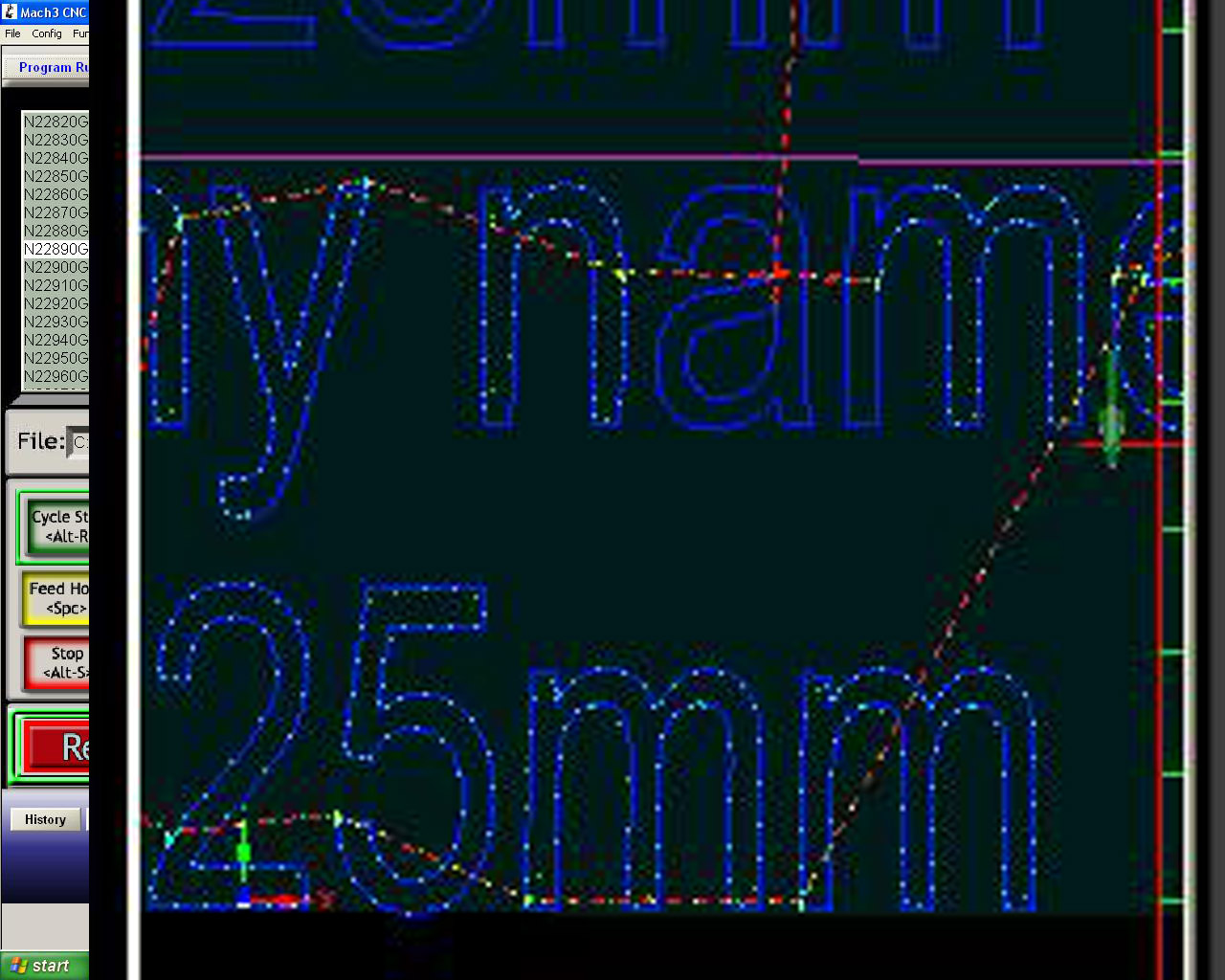 Here are the g-code and three screen grabs from Mach and one from Aspire. I've enlarged part of the screen to show how the toolpath shows it cutting corners on both the N and M on the text being cut out. I can post more/ or less if helps. Apologies for the large amount of gcode, I can post less in future if its suggested where I cut and paste.