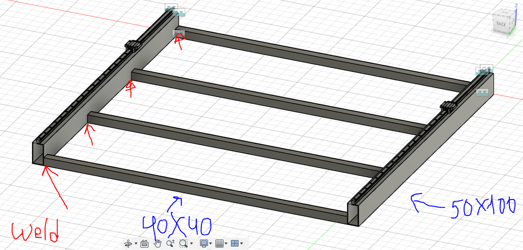 For the frame - ontop of the table I plan to use 100*50 RHS steel profile with 3.2mm wall - (two beams under the linear rails) in between them i will be welding 40*40 box section supports for the spoil board. also the two beams with bolts to the table.