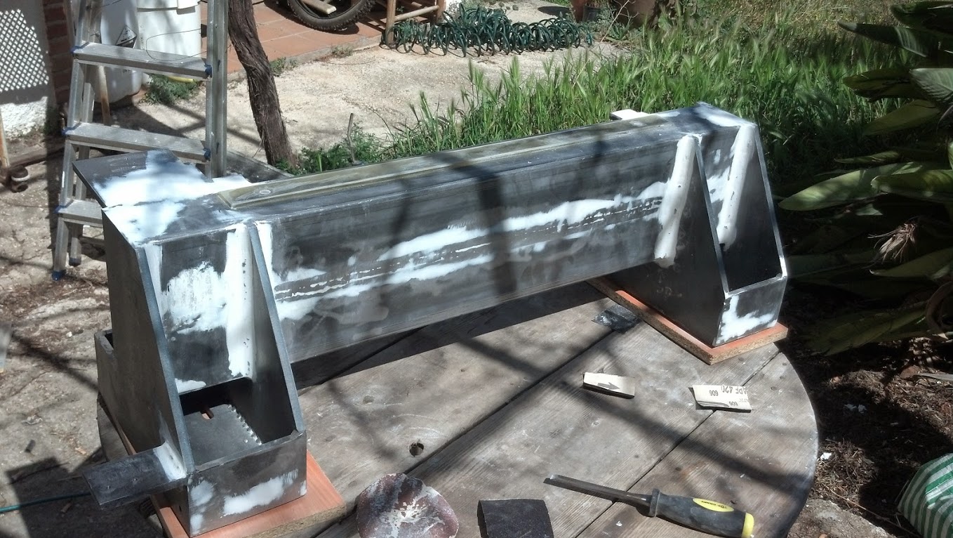 Now something very important. I will not move the frame at all. After a week has passed will solder the gantry and sides. Then will turn upside down the gantry and lay the upper side on the level surface of the epoxy. Then will pour epoxy on the gantry side plates that step on the Hiwin bearing blocks, connecting them together. Also pour epoxy on the lower side of the gantry beam. When dry, will turn the nagtry to normal position , rest the leveled side plates / epoxy on epoxy/ and pour the final epoxy at the top side of the gantry beam.