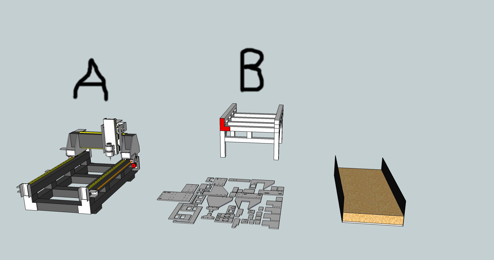 the element A is a benchtop cnc 400x1000x200. The element B is not a table. It is another CNC, 1000x1500x200. It is the same, just scale the gantry.