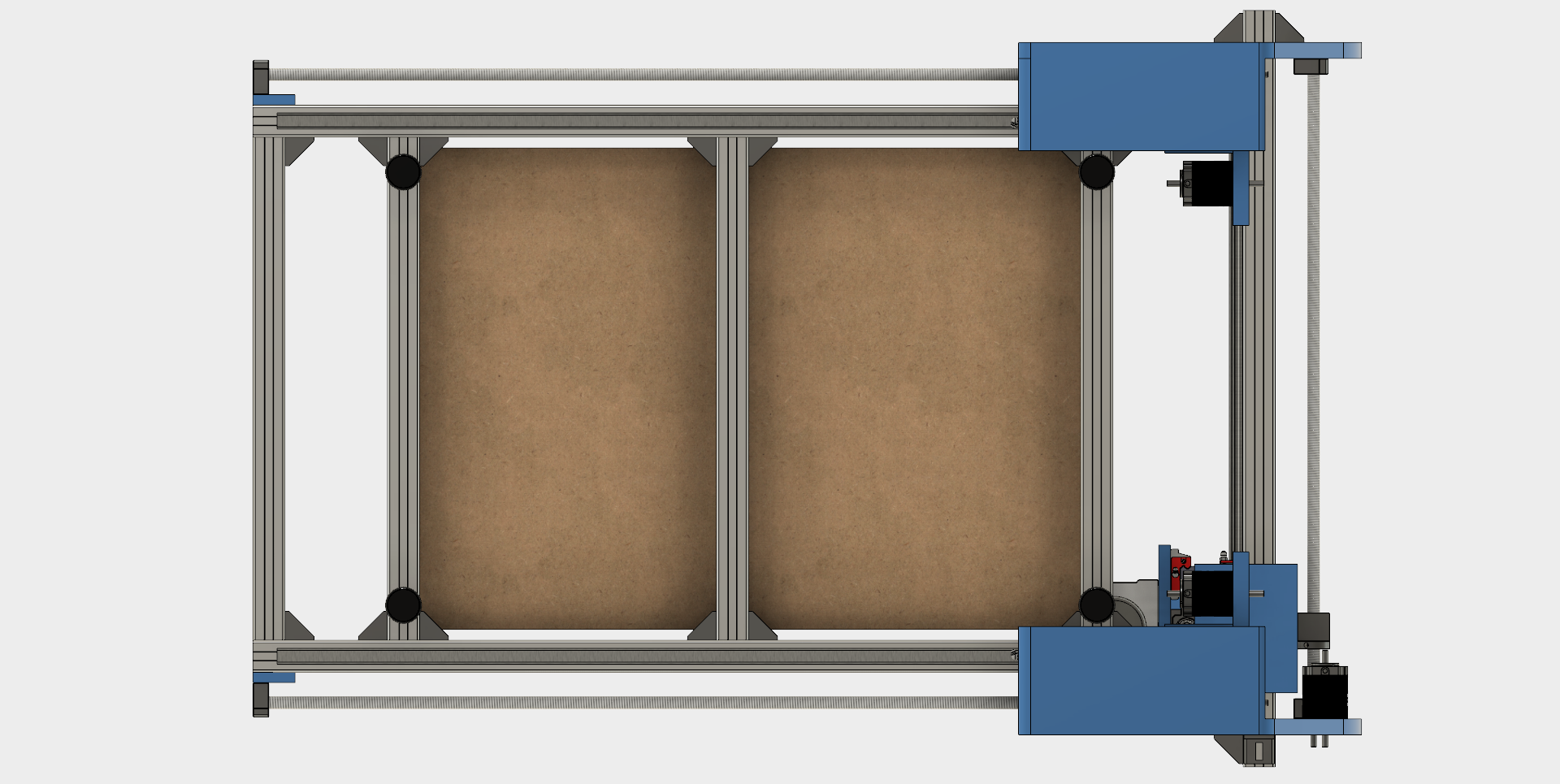 The rails (20mm) for the gantry are located under the bed in order to save some width and reduce the amount of dust contact that will inevitably occur. No idea if this is a good idea, or a disaster in the making. Gantry walls are 20mm thick.