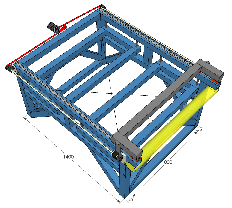 This machine will have a 4th axis on the short end that over hangs, 150mm of overhang. The large overhang is to keep frame floor footprint down and saves wasted frame material.