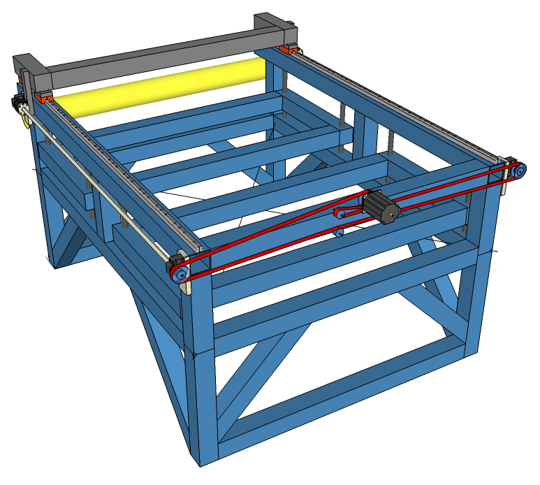 The X-Axis rails will have an overhang of about 100mm to cater for end-machining and allow for a future 4th-Axis roughly in the area coloured yellow.