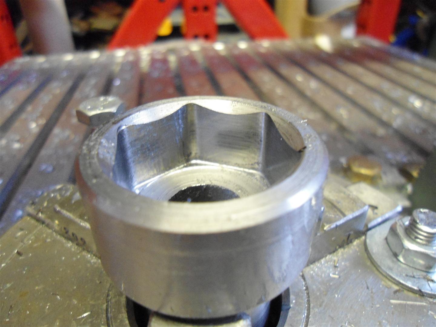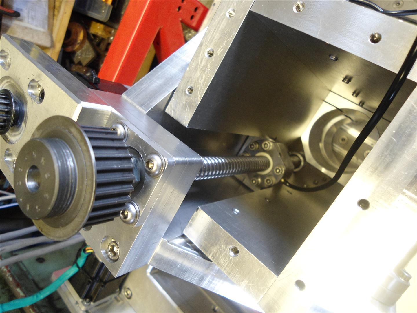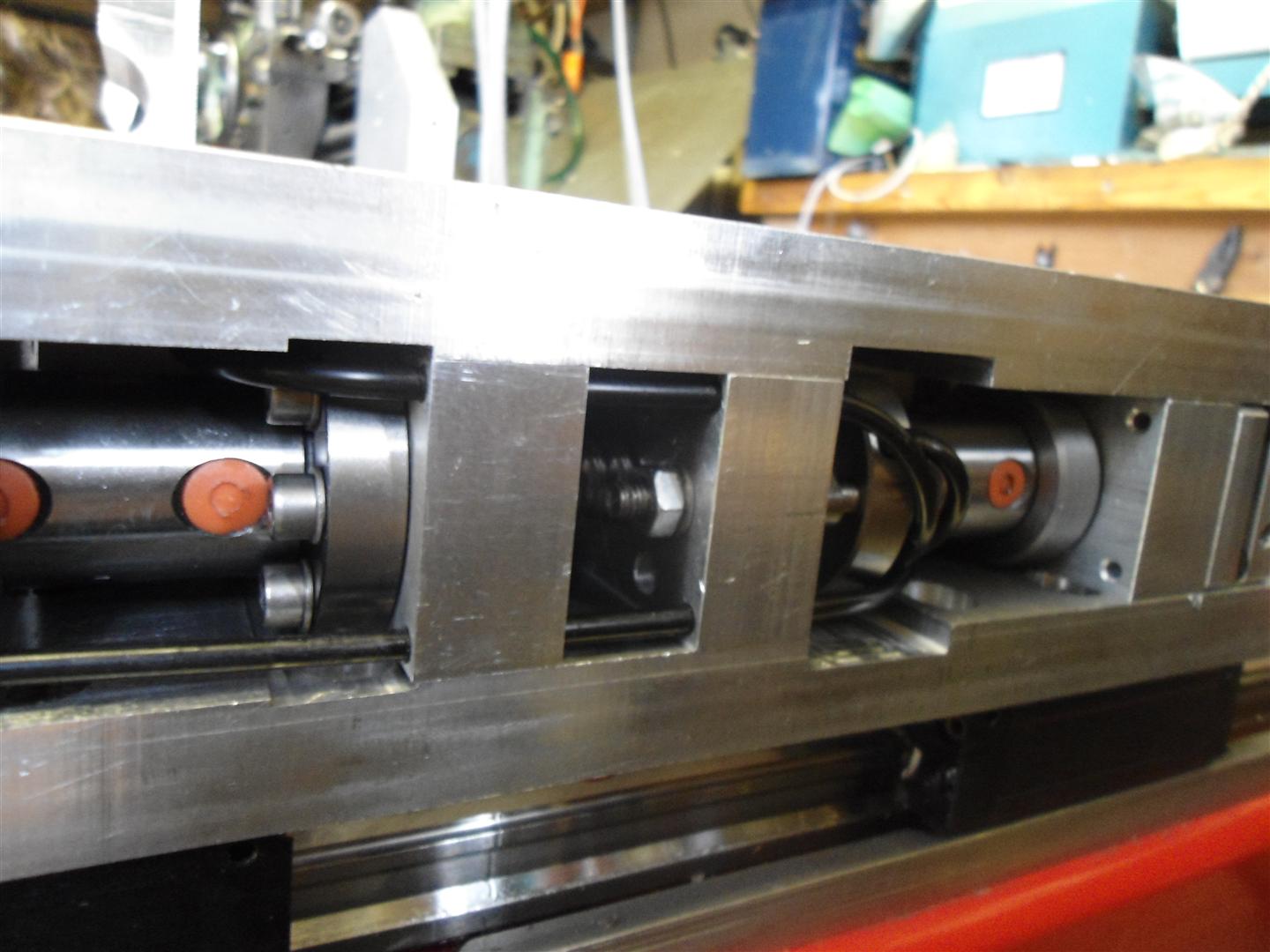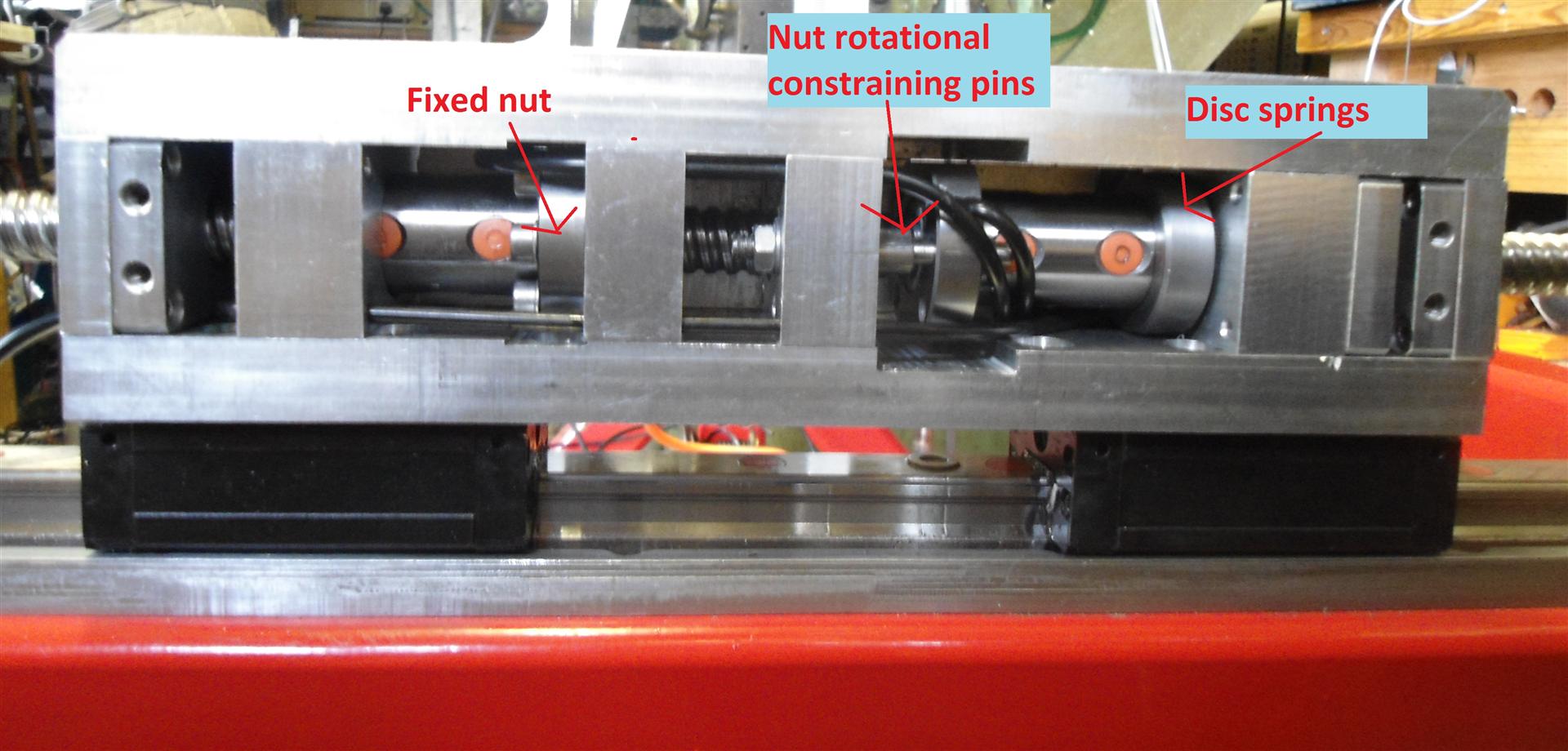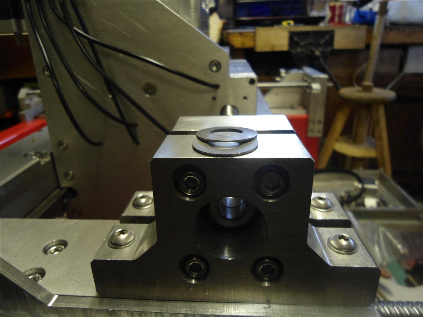 The Z-axis is easy since gravity pre-loads it, due to the large mass of the Z-axis, so there was no need incorporate a second nut here. Although the cutting force parallel to Z could exceed the weight of the axis whilst drilling, a <0.05mm error introduced due to backlash is insignificant here. For the X and Y axes two ballnuts were used on each screw, with one attached as normal and the other preloaded against the screw using disk springs. This nut is constrained rotationally via pins, since any rotation would introduce backlash. Easiest to explain with a picture, so here's the finished mechanism on one side of X, which is identical to the other side: