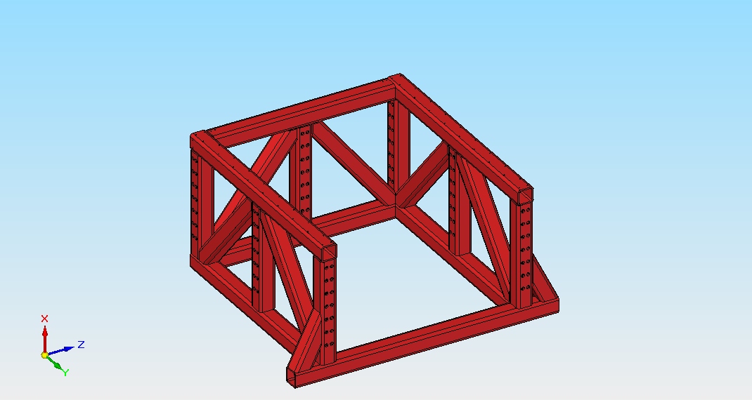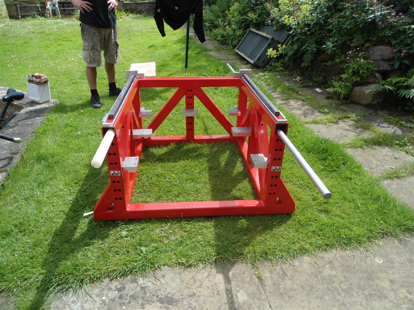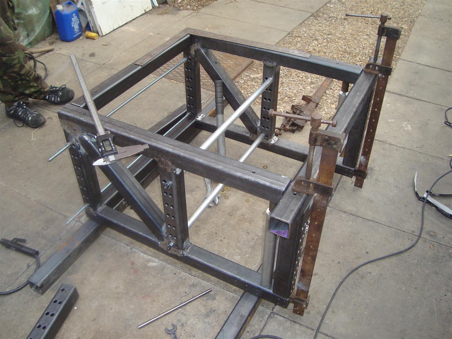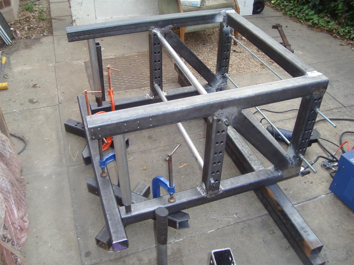 The high stiffness requirement dictated making a substantial frame, however it could not be too heavy for portability reasons. After a suitable mixture of calculation and guesswork we opted for 60x60x5mm box section and a largely generic frame was designed with the obvious diagonals added for additional strength: