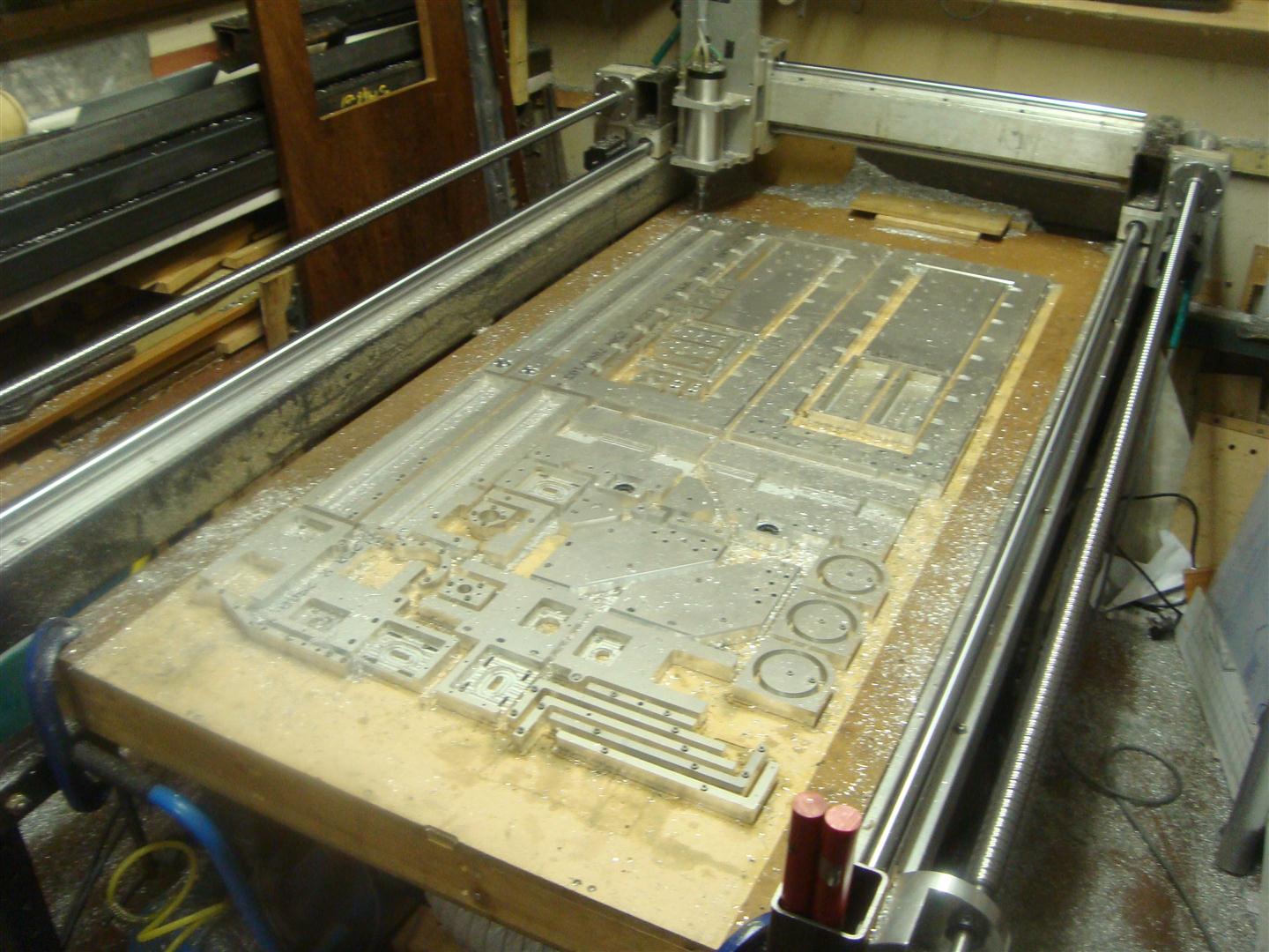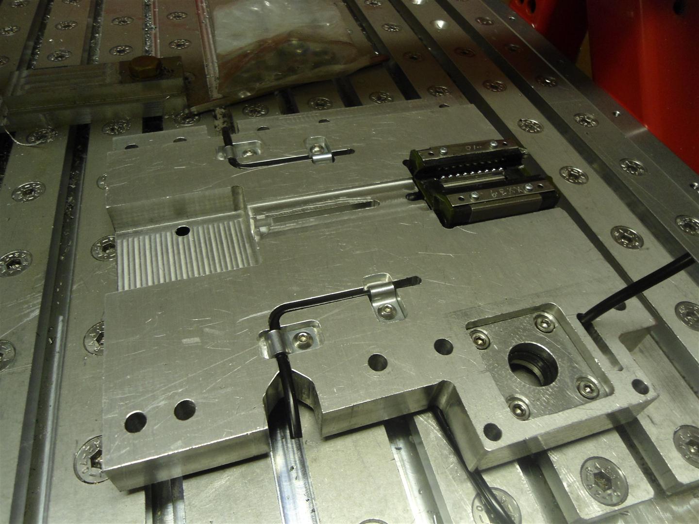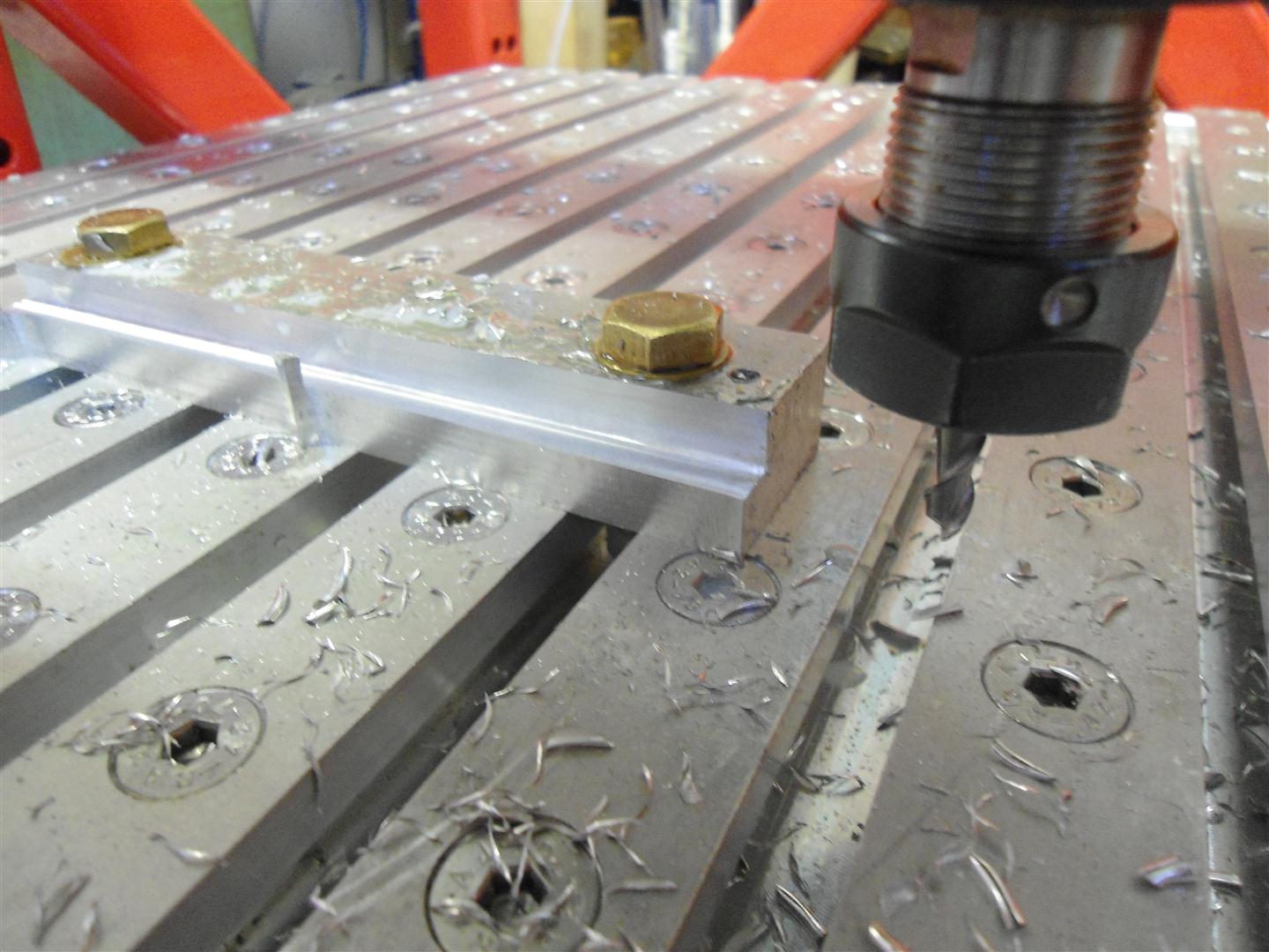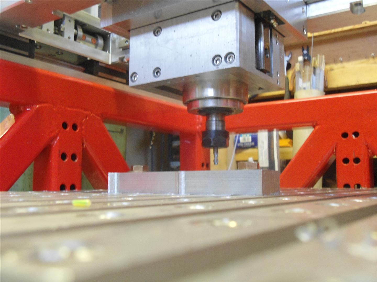 Before finishing the machine, I assembled the majority of it to find any problems or parts that would need altering. This gave the opportunity to test cutting something, so I put an offcut of 20mm 6082-T6 aluminium plate on the bed: