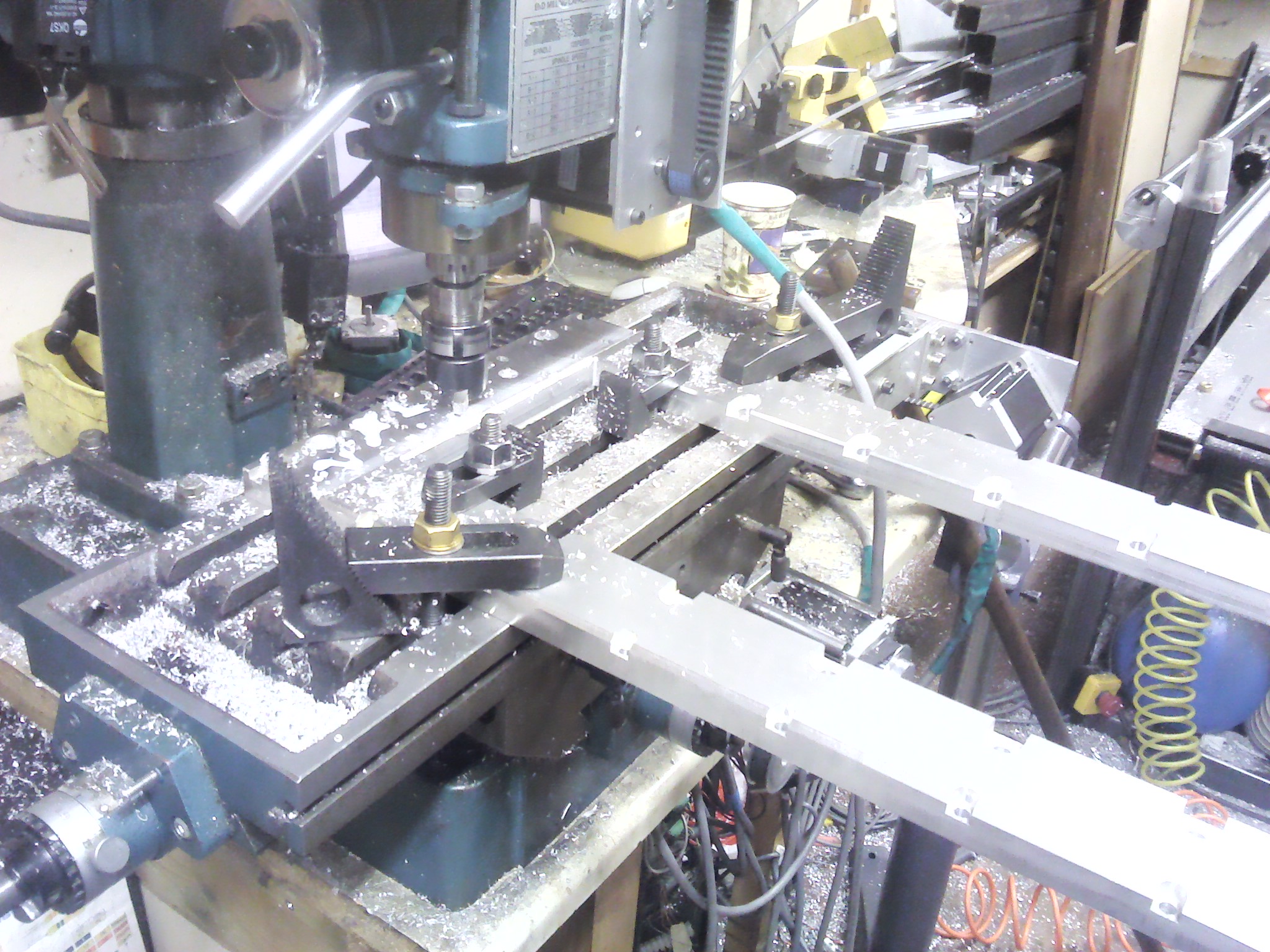 The required stiffness for the machine dictates using an adjustable height bed, so an array of holes were drilled in the frame to accommodate this: